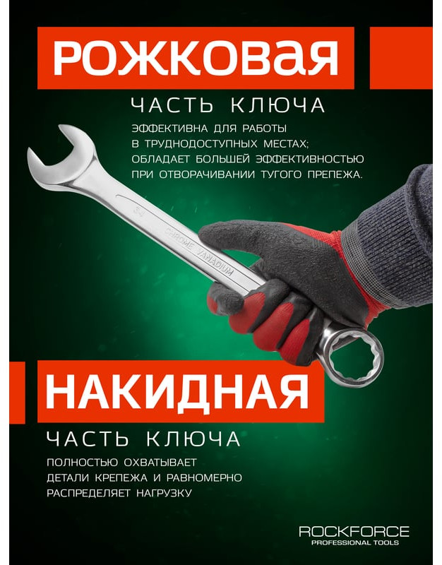Ключ комбинированный рожково-накидной от Rockforce — это незаменимый инструмент в любом наборе, который обеспечивает удобство и эффективность при выполнении множества задач.