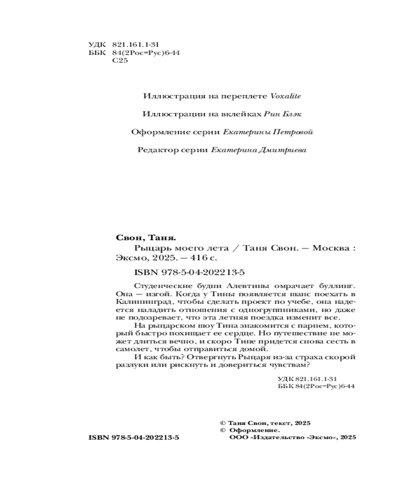 Серия: Романтические истории Тани Свон «Рыцарь моего лета» — это книга о первой и трепетной любви, которая делает человека сильнее. Она дарит крылья и помогает пройти преграды, а еще позволяет заглянуть внутрь себя, чтобы наконец разобраться, чего на самом деле желает сердце. |