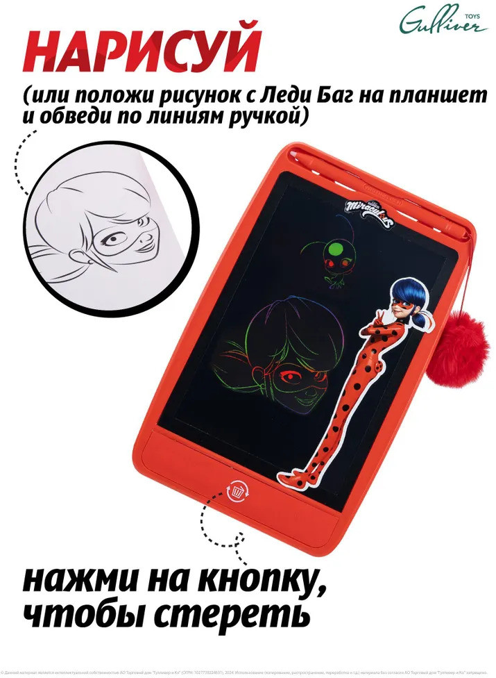 Серия: Леди Баг и Супер Кот Планшет для рисования настоящая находка для детей и их родителей. На планшете можно писать, рисовать, считать и стирать все рисунки и надписи нажатием одной кнопки. Рисование на планшете подобно рисованию на бумаге: в отличие от электронных устройств, его дисплей полностью безопасен для зрения, поскольку не излучает свет. В комплекте к устройству прилагается специальный стилус, с помощью которого можно рисовать. |