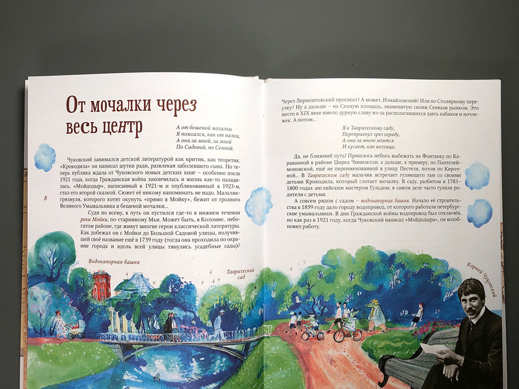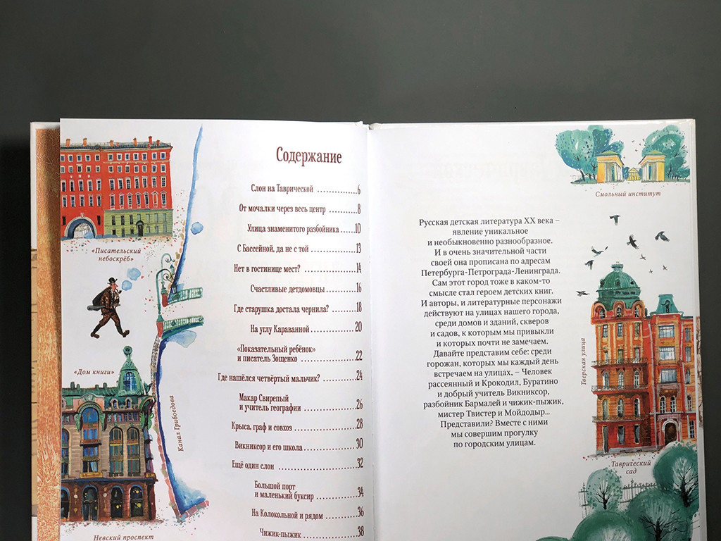 «Город литературных героев» проведёт нас маршрутами персонажей детских книг, среди домов и зданий, скверов и садов, к которым мы привыкли и которых почти не замечаем. «Человек рассеянный», Крокодил, Буратино, Бармалей, Мойдодыр, чижик-пыжик — вместе с ними (и другими героями) мы отправляемся гулять по Петербургу.