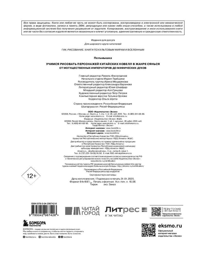 💳 Оплатить за товар можно при получении 🇰🇿 Есть бесплатная доставка по Казахстану 🎁 Копите бонусы с каждой покупки Серия: Гик-рисование. Книги по культовым мирам и вселенным Перед вами первое в России авторское пособие по созданию персонажей любимых китайских романов в жанре сянься от белорусской художницы Пельмышки! Сянься (仙侠) — это популярный в Китае жанр фэнтези, основанный на концепциях даосизма, буддизма и китайской мифологии. В переводе с китайского «сянь» (仙) означает «бессмертный» или «небожитель», а «ся» (侠) — «герой», «благородный человек». Примеры, приведенные в этой книге вместе с пошаговыми руководствами, помогут познакомиться с одним из самых известных литературных жанров в Китае. Вместе с ним вы узнаете про разные исторические эпохи, разберете отличительные детали и особенности персонажей, насладитесь эстетикой времен средневекового Китая и даже создадите собственных героев в полюбившемся сеттинге. |