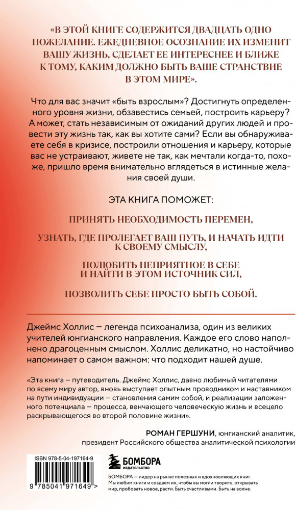 💳 Оплатить за товар можно при получении 🇰🇿 Есть бесплатная доставка по Казахстану 🎁 Копите бонусы с каждой покупки Серия: Психология души. Путь к осмысленной жизни Джеймс Холлис, юнгианский психоаналитик, предлагает исследовать смыслы, которые выведут вас из тупика, где вы терпите неприятную работу и людей, которые вас не вдохновляют, на дорогу ценностей и удовлетворенности жизнью. |