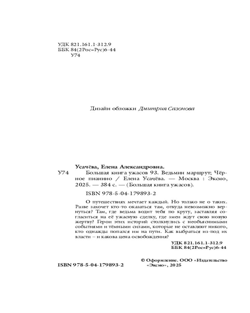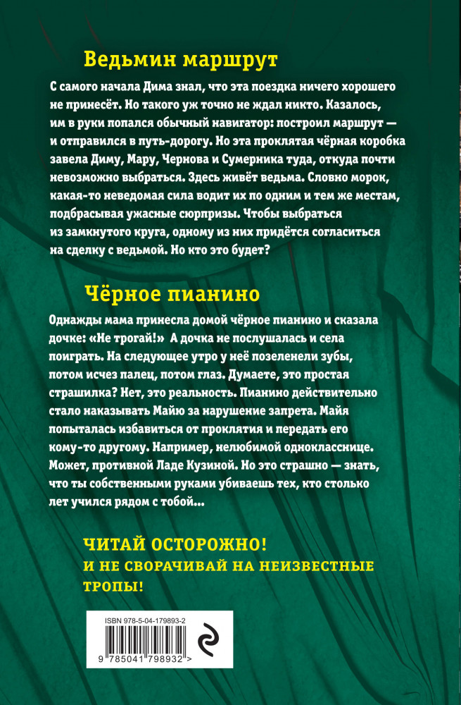 В данный момент этот товар отсутствует в продаже. Возможно, у нас найдется аналогичный или похожий товар здесь. Серия: Большая книга ужасов 3 страшных истории под одной обложкой! Мистика, ужасы, приключения для подростков. Подарок любителям пощекотать нервы... и взглянуть в лицо своему страху! О путешествиях мечтает каждый. Но только не о таких. Разве захочет кто-то оказаться там, откуда невозможно вернуться. Там, где ведьма водит тебя по кругу, заставляя согласиться на её ужасную сделку, где змеи ждут свою новую жертву. Герои этих историй столкнулись с необъяснимыми событиями и тёмными силами, которые не оставляют никого, кто однажды попался им на пути. Как выбраться из-под их власти — и какова цена за освобождение? |