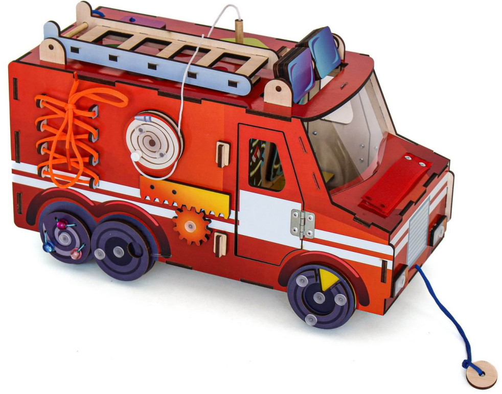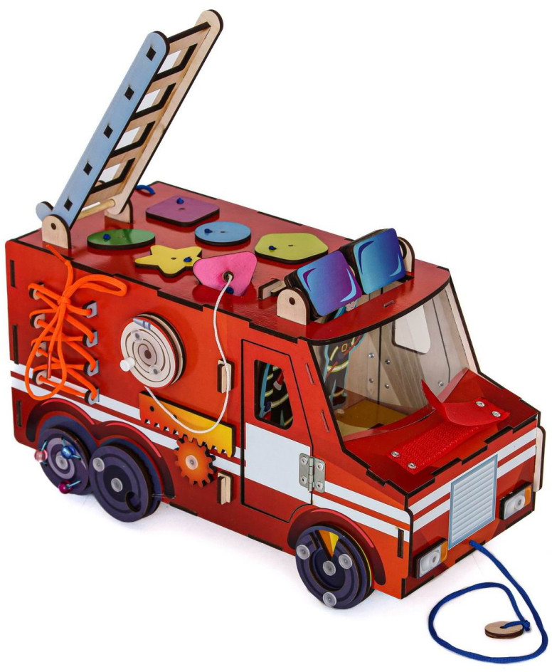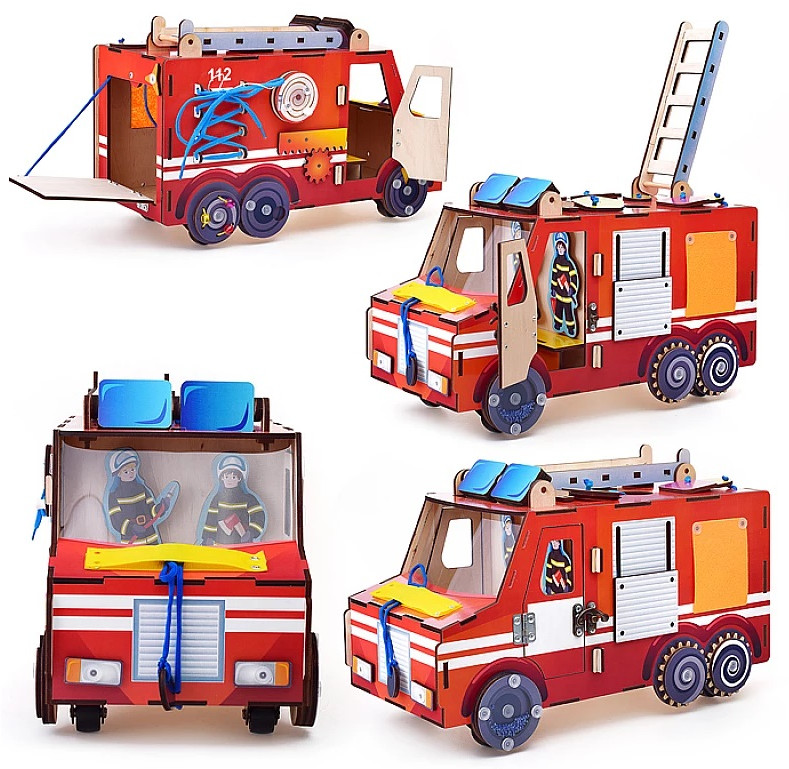 • экологичный бизиборд «Пожарная машина» из дерева — это игрушка для развития логики, интеллекта, памяти;
