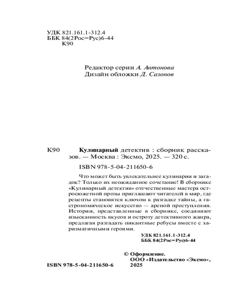 Серия: Великолепные детективные истории. Новое оформление (обложка) Что может быть увлекательнее кулинарии и загадок? Только их неожиданное сочетание! В сборнике «Кулинарный детектив» отечественные мастера остросюжетной прозы приглашают читателей в мир, где рецепты становятся ключом к разгадке тайны, а гастрономическое искусство — ареной преступления. Истории, представленные в сборнике, соединяют изысканность вкусов и остроту детективного жанра, предлагая разгадать пикантные ребусы вместе с харизматичными героями. |