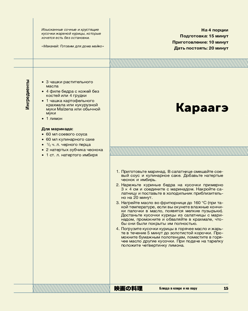Серия: Мировая еда. Кинорецепты Посмотрите на мир японской гастрономии через призму любимых фильмов и аниме! Внутри вас ждут тщательно отобранные и простые в приготовлении рецепты, подходящие как для начинающих кулинаров, так и для опытных гурманов. Каждое блюдо сопровождается рассказом о фильме или сериале, который стал источником вдохновения: от бессмертной классики вроде «Токийской повести» Ясудзиро Одзу и «Жить» Акиры Куросавы до современных сериалов «Самурай-гурман» и «Что ты ел вчера?» |