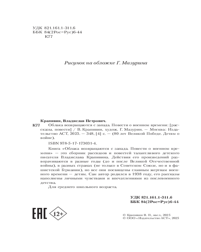Облака возвращаются с запада. Повести о военном времениВ данный момент этот товар отсутствует в продаже. Возможно, у нас найдется аналогичный или похожий товар здесь. Серия: 80 лет Великой Победе. Детям о войне Книга «Облака возвращаются с запада. Повести о военном времени» — это сборник рассказов и повестей талантливого детского писателя Владислава Крапивина. Действия его произведений разворачиваются в разные годы (до и после Великой Отечественной войны), в разных странах (не только в Советском Союзе, но и в фашистской Германии), но все они посвящены главным жертвам военного времени — детям. Сам автор родился в 1938 году, его рассказы наполнены личными чувствами и впечатлениями из послевоенного |