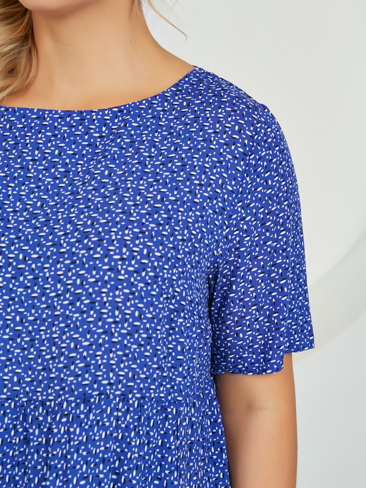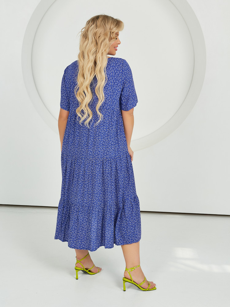 Платье с трехъярусной юбкой — тренд летнего сезона! Платье в мелкий цветочек любят женщины разного возраста, начиная от маленьких девочек и заканчивая дамами солидного возраста. Модель выполнена из приятной и мягкой плательной ткани, имеет классическую овальную горловину и втачной короткий рукав. Фасон платья смотрится просто и комфортно, при этом — очаровательно. Платье идеально сочетается с модными сапогами в ковбойском стиле, кедами и джинсовой курткой, а также с модельной обувью и изящной сумочкой.