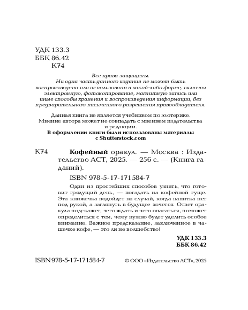 Серия: Книга гаданий Один из простейших способов узнать, что готовит грядущий день, — погадать на кофейной гуще. Эта книжечка подойдет на случай, когда напитка нет под рукой, а заглянуть в будущее хочется. Ответ оракула подскажет, чего ждать и чего опасаться, поможет определиться с тем, чему нужно будет уделить особое внимание. Важное предсказание, заключенное в чашечке кофе, — это ли не волшебство! |