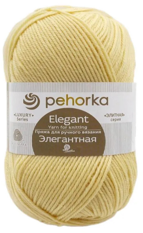 «Элегантная» — пряжа из элитных пехорских нитей. Вырабатывается из импортного сырья и соответствует стандартам качества. Она идеально хороша по всем параметрам. Ровные, упругие, красивые, классической крутки моточки. Визуальная привлекательность пряжи усиливается и тактильными ощущениями: нить мягкая, приятная к телу, эластичная. К тому же отлично ведет себя в работе! Сама по себе мериносовая шерсть тонкая, легкая, прочная, с естественным завитком, что придает пряже упругость, а изделиям — формоустойчивость.