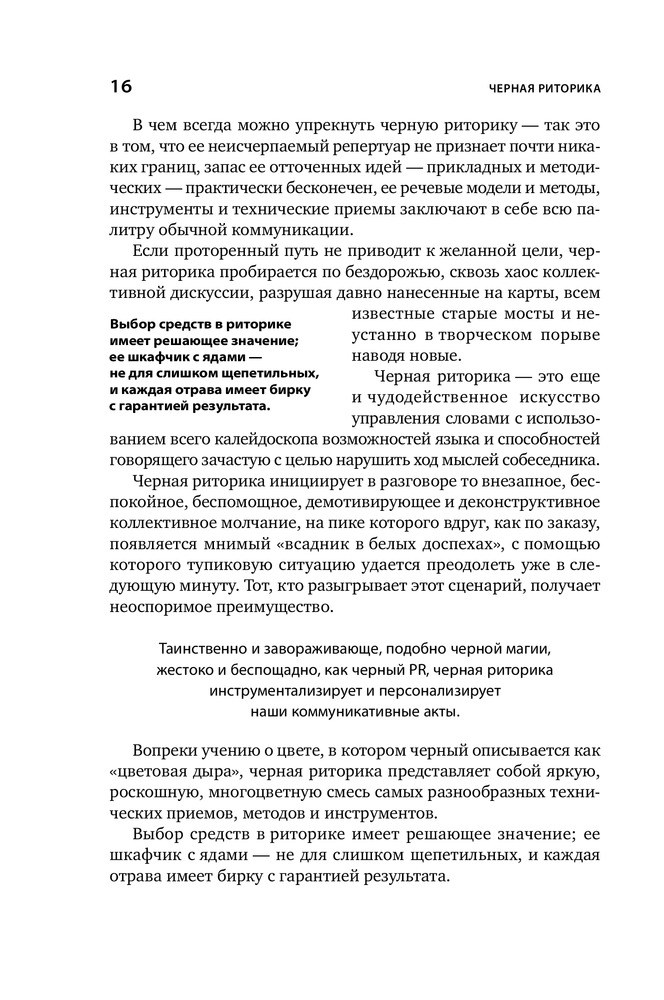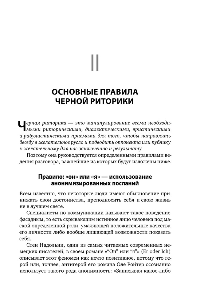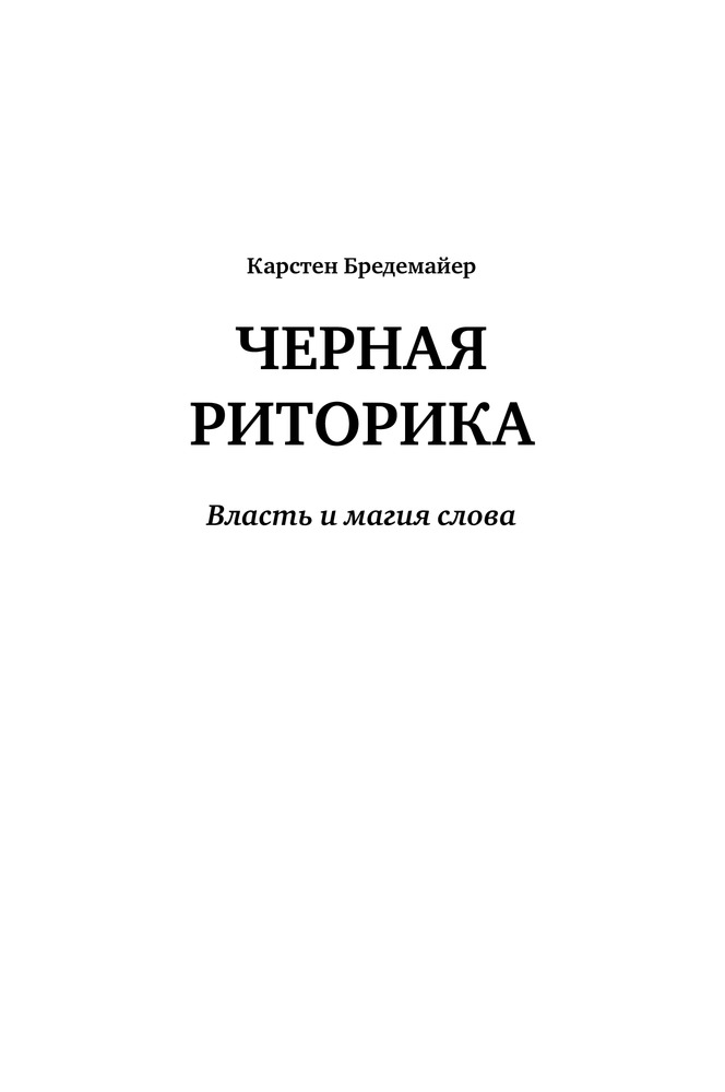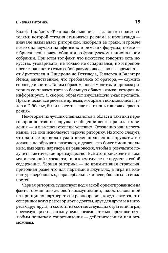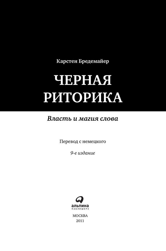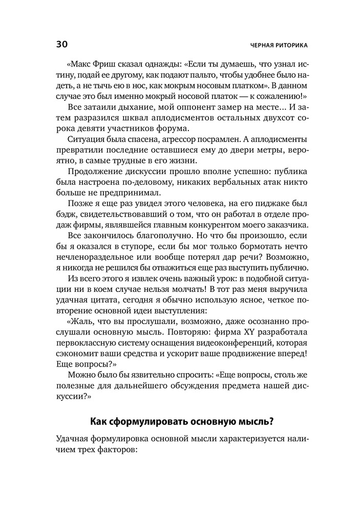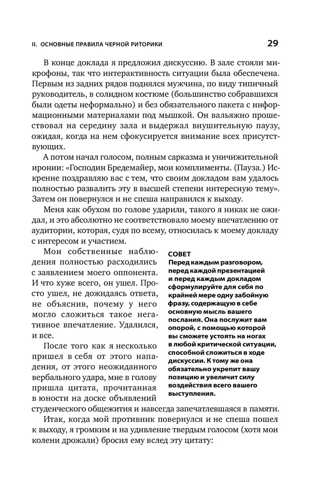 картинка Sandriya "Власть и магия слова" - весьма полезная книга для тех, кто частенько сталкивается с публичными выступлениями, для нлп-еров, для людей, основным рабочим инструментом которых является "слово". Собственно, я об этой книге знал уже очень давно, а вот прочесть собрался только сейчас, чему рад. Несмотря на то, что я могу с уверенностью сказать, что весь материал книги мне знаком - все же "повторение - мать учения". Конечно, гордость у меня присутствует за свою бессознательную компетенцию, однако я рад, что есть в "Черной риторике" и нечто новое для меня - названия и термины. По примерам-то я сразу понималто чем идет речь, а вот попроси меня перечислить классификацию вопросов (а она в книге подана прекрасно и полноценно) - я бы затруднился с ответом. Так что весьма и весьма много проку. Итак, данный труд Бредемайера представляет собой: 1. Объяснение понятий: риторика, диалектика, эристика, рабулистика, конкретно черная риторика. 2. Правила использования "черной риторики", ее характеристика и советы по качественному применению. 3. Уловки и стратегические элементы. 4. Классификация вопросов, их постановка, а также позитивные/негативные контексты постановки. 5. Характеристика и рекомендации по использованию такой модели ведения разговора, как призыв. Пожалуй, "красной нитью" представленной книги являются такие мысли: 1. Практически в любом виде общения лучше быть ведущим, чем ведомым. 2. При всяких нападках можно защититься "словом". 3. Прежде, чем спрашивать и призывать, стоит вооружиться достоверной информацией и фактами. 4. Очень полезно перед каждым своим выступлением произвести подготовку, не только настроившись, но и предусмотрев, какие "каверзы" могут произойти. 5. Самое главное в общении то, насколько уверенными мы себя почувствуем, несмотря на ситуацию. Именно от этого и зависит наш успех. Ну, и в конечном счете, Черная риторика — это умение: • использовать все необходимые риторические средства и методы для того, чтобы направлять беседу в желательное русло и подводить оппонента или публику к нужному для вас заключению и результату; отличать, в каком контексте и при каких вопросах ваши аргументы ничего не значат или, наоборот, являются определяющими; • разрешать противоречия и давать «красную нить» каждому разговору; • превращать негативное мышление и поведение собеседника в позитивное и конструктивное; находчиво и элегантно устранять ловушки; в горячих дискуссиях не терять головы и вести себя уверенно.