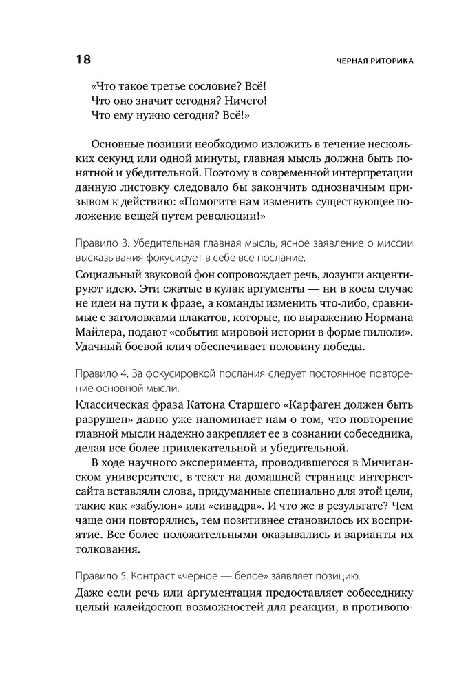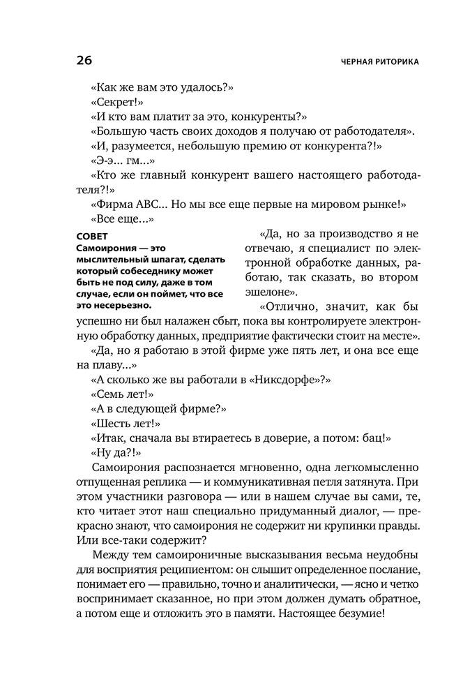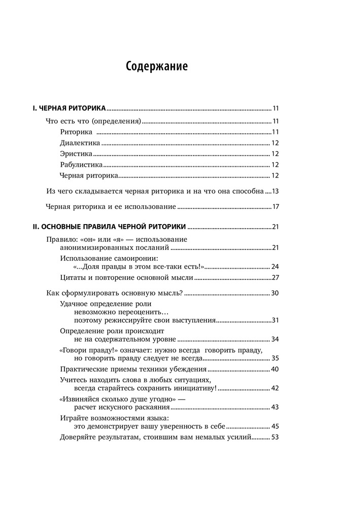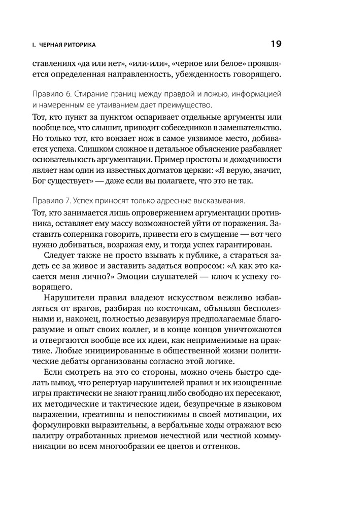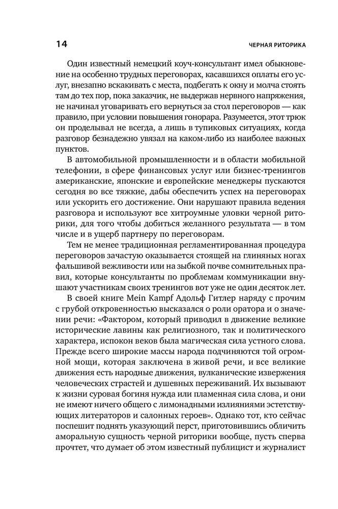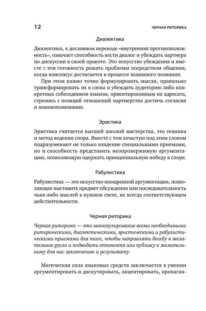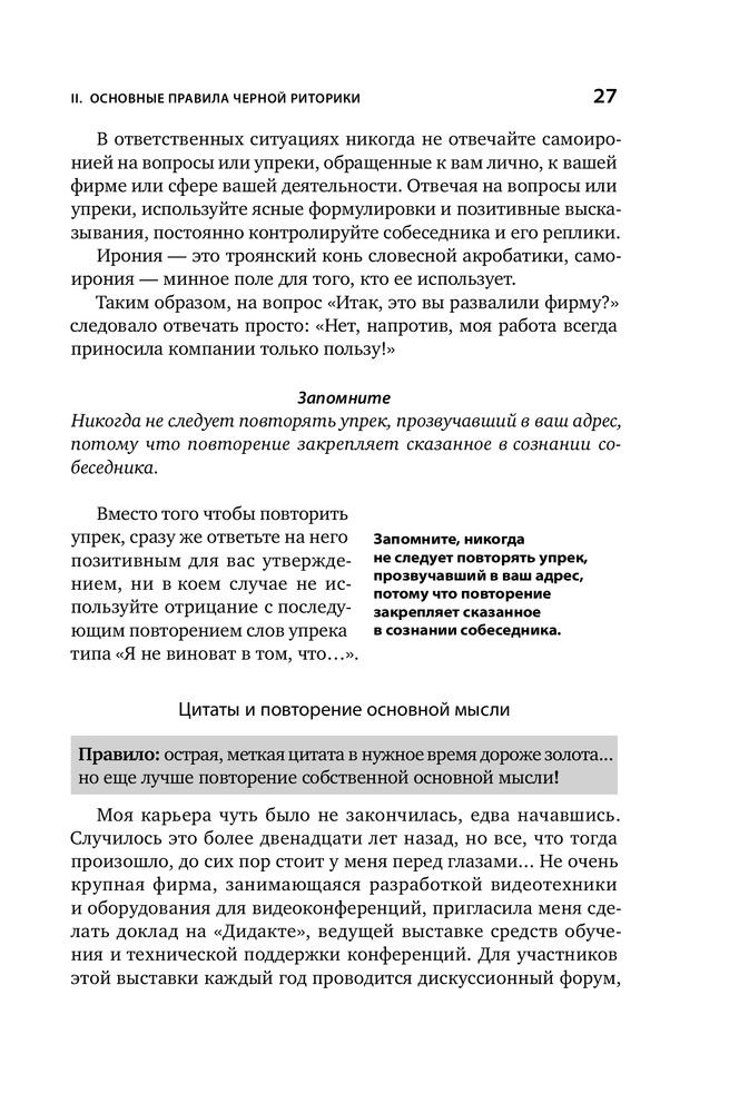 картинка Sandriya "Власть и магия слова" - весьма полезная книга для тех, кто частенько сталкивается с публичными выступлениями, для нлп-еров, для людей, основным рабочим инструментом которых является "слово". Собственно, я об этой книге знал уже очень давно, а вот прочесть собрался только сейчас, чему рад. Несмотря на то, что я могу с уверенностью сказать, что весь материал книги мне знаком - все же "повторение - мать учения". Конечно, гордость у меня присутствует за свою бессознательную компетенцию, однако я рад, что есть в "Черной риторике" и нечто новое для меня - названия и термины. По примерам-то я сразу понималто чем идет речь, а вот попроси меня перечислить классификацию вопросов (а она в книге подана прекрасно и полноценно) - я бы затруднился с ответом. Так что весьма и весьма много проку. Итак, данный труд Бредемайера представляет собой: 1. Объяснение понятий: риторика, диалектика, эристика, рабулистика, конкретно черная риторика. 2. Правила использования "черной риторики", ее характеристика и советы по качественному применению. 3. Уловки и стратегические элементы. 4. Классификация вопросов, их постановка, а также позитивные/негативные контексты постановки. 5. Характеристика и рекомендации по использованию такой модели ведения разговора, как призыв. Пожалуй, "красной нитью" представленной книги являются такие мысли: 1. Практически в любом виде общения лучше быть ведущим, чем ведомым. 2. При всяких нападках можно защититься "словом". 3. Прежде, чем спрашивать и призывать, стоит вооружиться достоверной информацией и фактами. 4. Очень полезно перед каждым своим выступлением произвести подготовку, не только настроившись, но и предусмотрев, какие "каверзы" могут произойти. 5. Самое главное в общении то, насколько уверенными мы себя почувствуем, несмотря на ситуацию. Именно от этого и зависит наш успех. Ну, и в конечном счете, Черная риторика — это умение: • использовать все необходимые риторические средства и методы для того, чтобы направлять беседу в желательное русло и подводить оппонента или публику к нужному для вас заключению и результату; отличать, в каком контексте и при каких вопросах ваши аргументы ничего не значат или, наоборот, являются определяющими; • разрешать противоречия и давать «красную нить» каждому разговору; • превращать негативное мышление и поведение собеседника в позитивное и конструктивное; находчиво и элегантно устранять ловушки; в горячих дискуссиях не терять головы и вести себя уверенно.