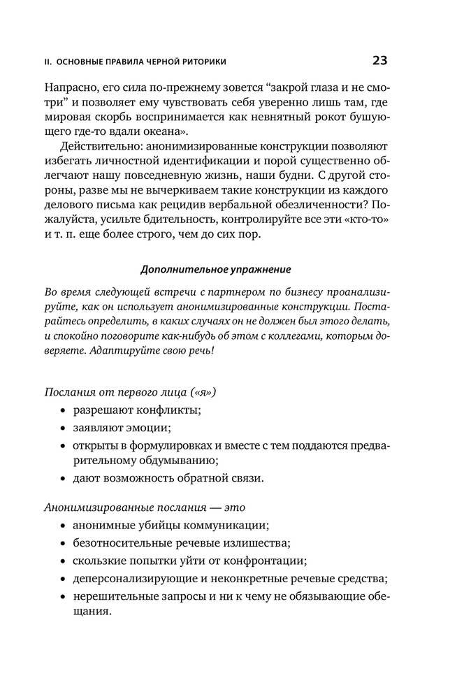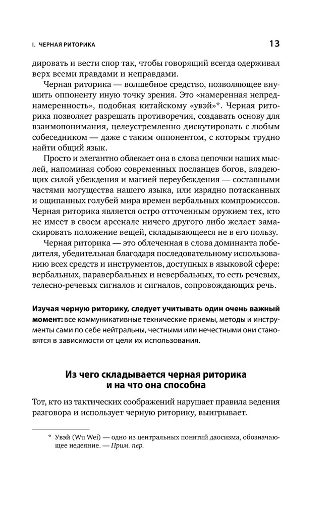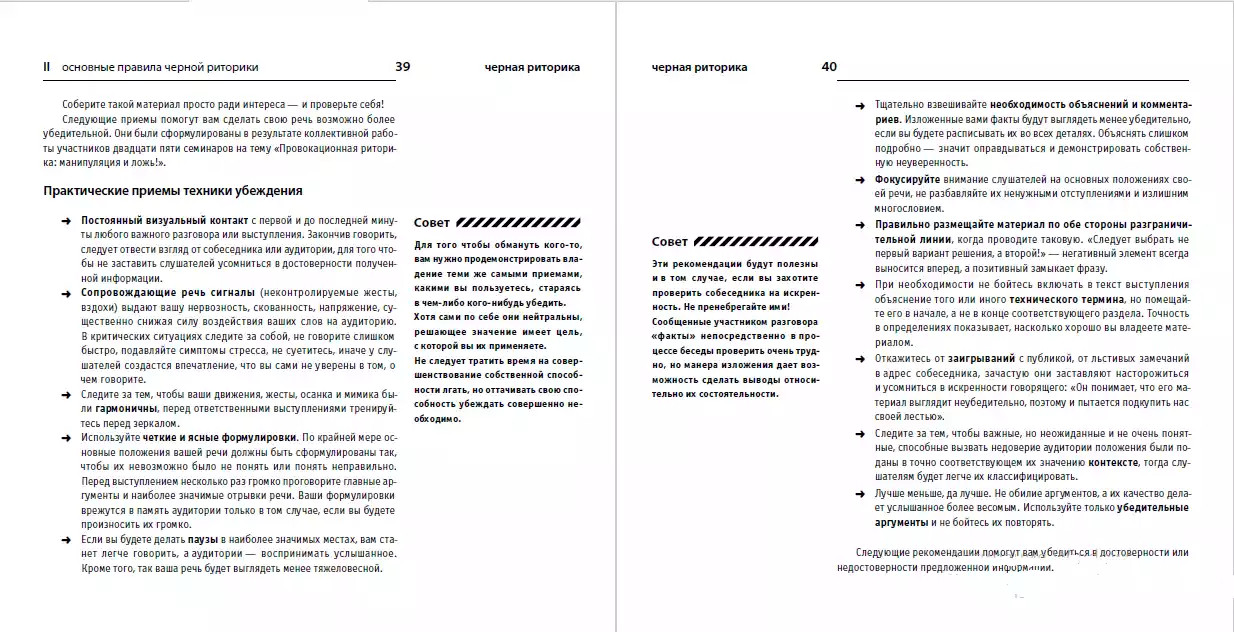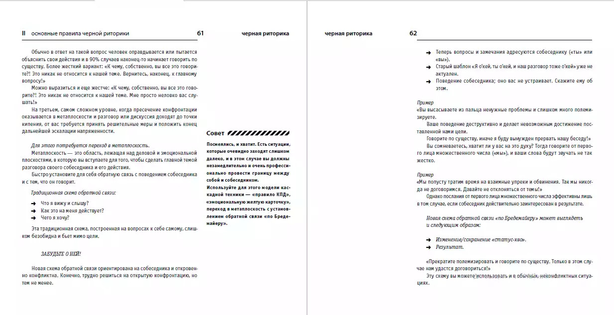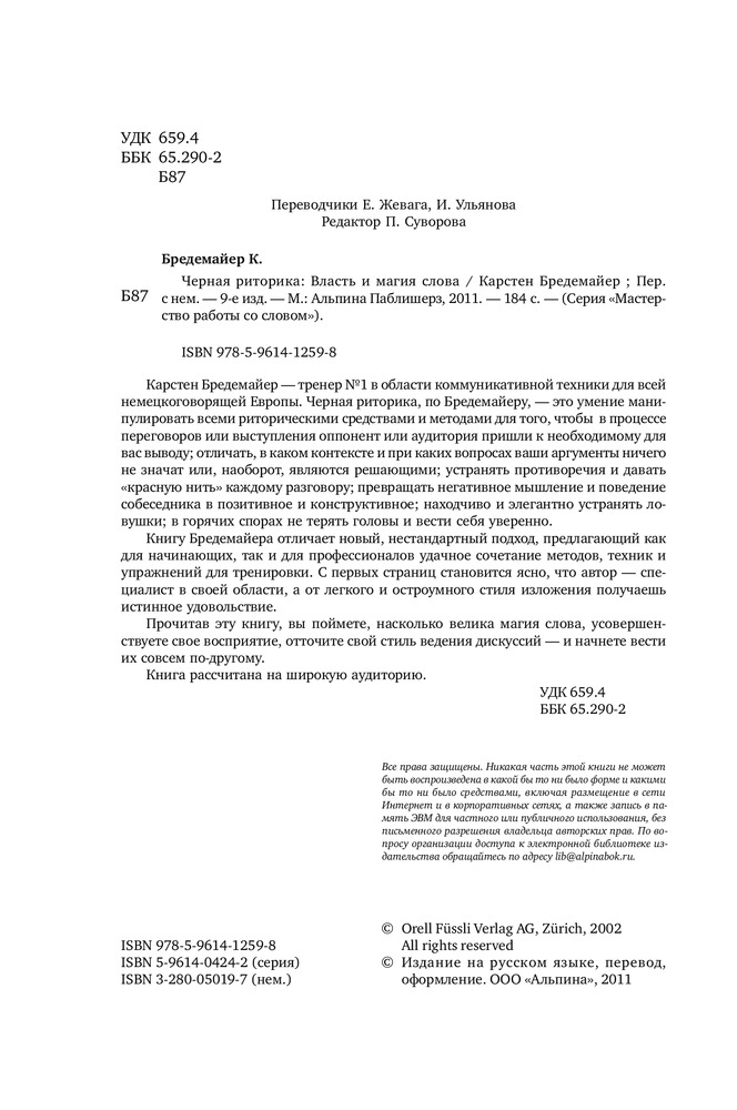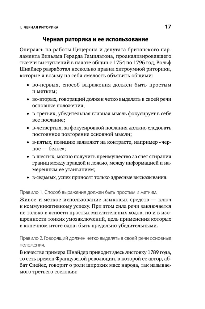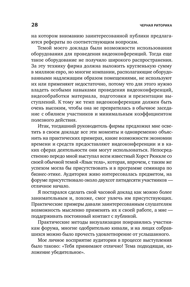 картинка Sandriya "Власть и магия слова" - весьма полезная книга для тех, кто частенько сталкивается с публичными выступлениями, для нлп-еров, для людей, основным рабочим инструментом которых является "слово". Собственно, я об этой книге знал уже очень давно, а вот прочесть собрался только сейчас, чему рад. Несмотря на то, что я могу с уверенностью сказать, что весь материал книги мне знаком - все же "повторение - мать учения". Конечно, гордость у меня присутствует за свою бессознательную компетенцию, однако я рад, что есть в "Черной риторике" и нечто новое для меня - названия и термины. По примерам-то я сразу понималто чем идет речь, а вот попроси меня перечислить классификацию вопросов (а она в книге подана прекрасно и полноценно) - я бы затруднился с ответом. Так что весьма и весьма много проку. Итак, данный труд Бредемайера представляет собой: 1. Объяснение понятий: риторика, диалектика, эристика, рабулистика, конкретно черная риторика. 2. Правила использования "черной риторики", ее характеристика и советы по качественному применению. 3. Уловки и стратегические элементы. 4. Классификация вопросов, их постановка, а также позитивные/негативные контексты постановки. 5. Характеристика и рекомендации по использованию такой модели ведения разговора, как призыв. Пожалуй, "красной нитью" представленной книги являются такие мысли: 1. Практически в любом виде общения лучше быть ведущим, чем ведомым. 2. При всяких нападках можно защититься "словом". 3. Прежде, чем спрашивать и призывать, стоит вооружиться достоверной информацией и фактами. 4. Очень полезно перед каждым своим выступлением произвести подготовку, не только настроившись, но и предусмотрев, какие "каверзы" могут произойти. 5. Самое главное в общении то, насколько уверенными мы себя почувствуем, несмотря на ситуацию. Именно от этого и зависит наш успех. Ну, и в конечном счете, Черная риторика — это умение: • использовать все необходимые риторические средства и методы для того, чтобы направлять беседу в желательное русло и подводить оппонента или публику к нужному для вас заключению и результату; отличать, в каком контексте и при каких вопросах ваши аргументы ничего не значат или, наоборот, являются определяющими; • разрешать противоречия и давать «красную нить» каждому разговору; • превращать негативное мышление и поведение собеседника в позитивное и конструктивное; находчиво и элегантно устранять ловушки; в горячих дискуссиях не терять головы и вести себя уверенно.