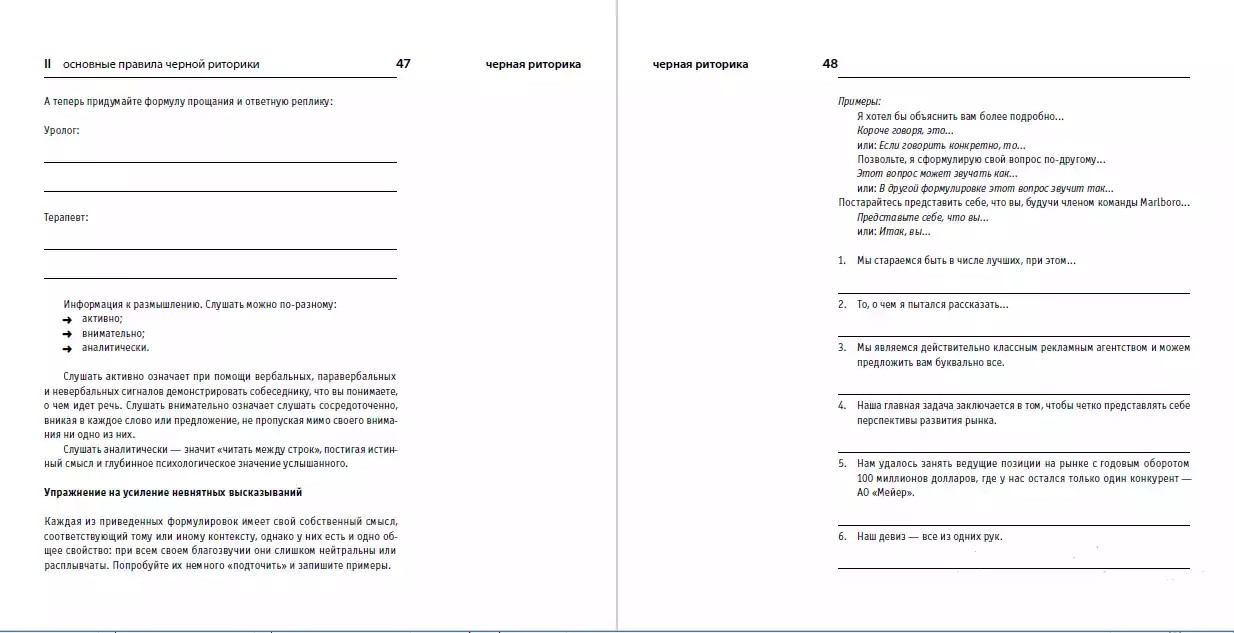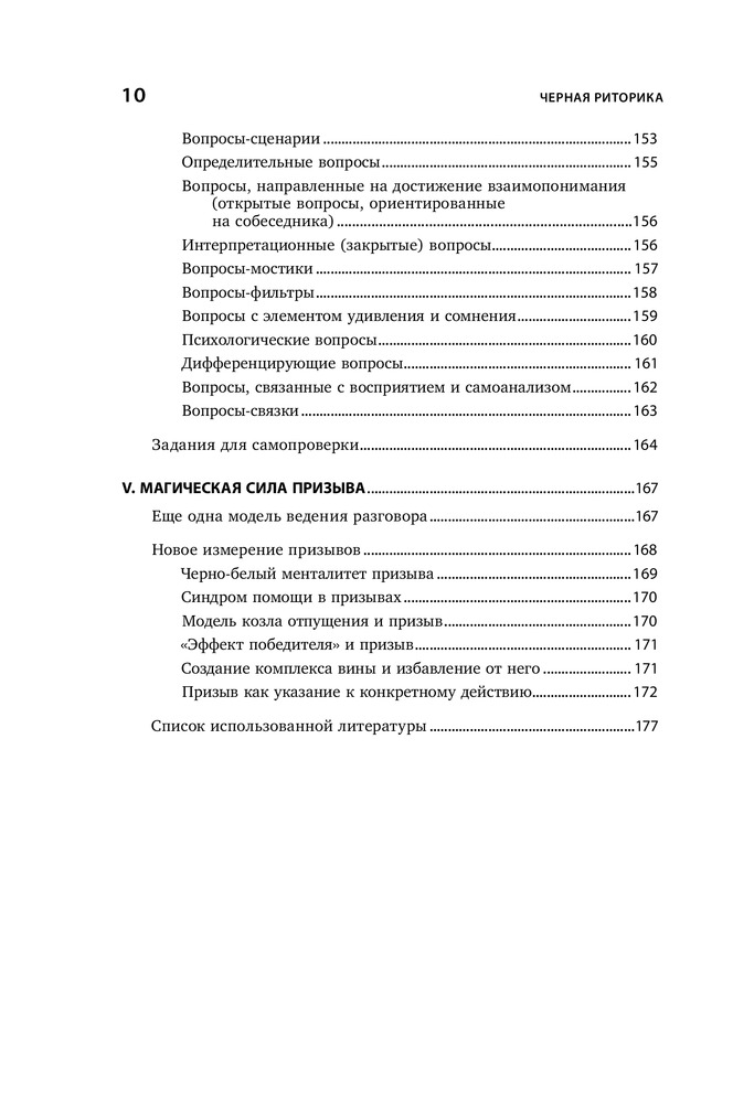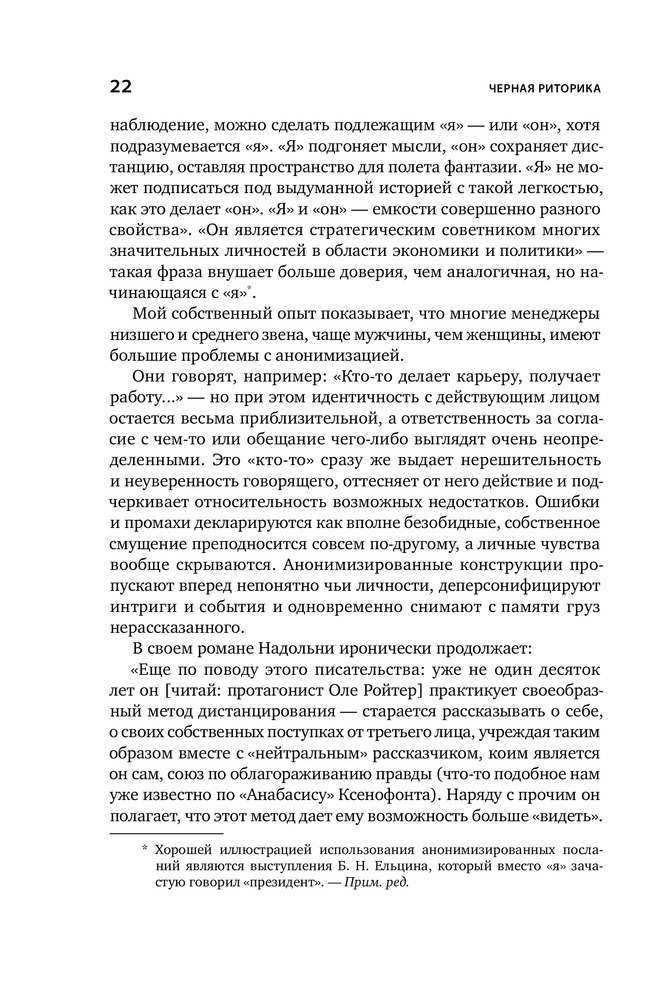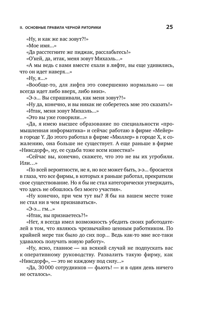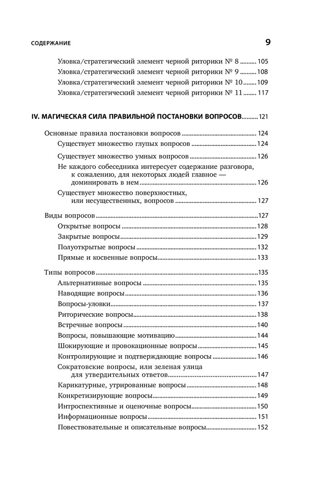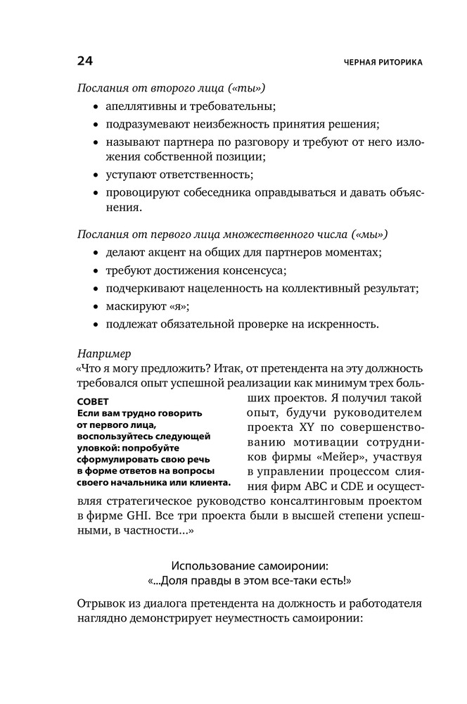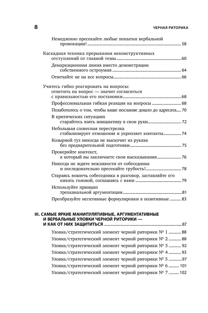 картинка Sandriya "Власть и магия слова" - весьма полезная книга для тех, кто частенько сталкивается с публичными выступлениями, для нлп-еров, для людей, основным рабочим инструментом которых является "слово". Собственно, я об этой книге знал уже очень давно, а вот прочесть собрался только сейчас, чему рад. Несмотря на то, что я могу с уверенностью сказать, что весь материал книги мне знаком - все же "повторение - мать учения". Конечно, гордость у меня присутствует за свою бессознательную компетенцию, однако я рад, что есть в "Черной риторике" и нечто новое для меня - названия и термины. По примерам-то я сразу понималто чем идет речь, а вот попроси меня перечислить классификацию вопросов (а она в книге подана прекрасно и полноценно) - я бы затруднился с ответом. Так что весьма и весьма много проку. Итак, данный труд Бредемайера представляет собой: 1. Объяснение понятий: риторика, диалектика, эристика, рабулистика, конкретно черная риторика. 2. Правила использования "черной риторики", ее характеристика и советы по качественному применению. 3. Уловки и стратегические элементы. 4. Классификация вопросов, их постановка, а также позитивные/негативные контексты постановки. 5. Характеристика и рекомендации по использованию такой модели ведения разговора, как призыв. Пожалуй, "красной нитью" представленной книги являются такие мысли: 1. Практически в любом виде общения лучше быть ведущим, чем ведомым. 2. При всяких нападках можно защититься "словом". 3. Прежде, чем спрашивать и призывать, стоит вооружиться достоверной информацией и фактами. 4. Очень полезно перед каждым своим выступлением произвести подготовку, не только настроившись, но и предусмотрев, какие "каверзы" могут произойти. 5. Самое главное в общении то, насколько уверенными мы себя почувствуем, несмотря на ситуацию. Именно от этого и зависит наш успех. Ну, и в конечном счете, Черная риторика — это умение: • использовать все необходимые риторические средства и методы для того, чтобы направлять беседу в желательное русло и подводить оппонента или публику к нужному для вас заключению и результату; отличать, в каком контексте и при каких вопросах ваши аргументы ничего не значат или, наоборот, являются определяющими; • разрешать противоречия и давать «красную нить» каждому разговору; • превращать негативное мышление и поведение собеседника в позитивное и конструктивное; находчиво и элегантно устранять ловушки; в горячих дискуссиях не терять головы и вести себя уверенно.
