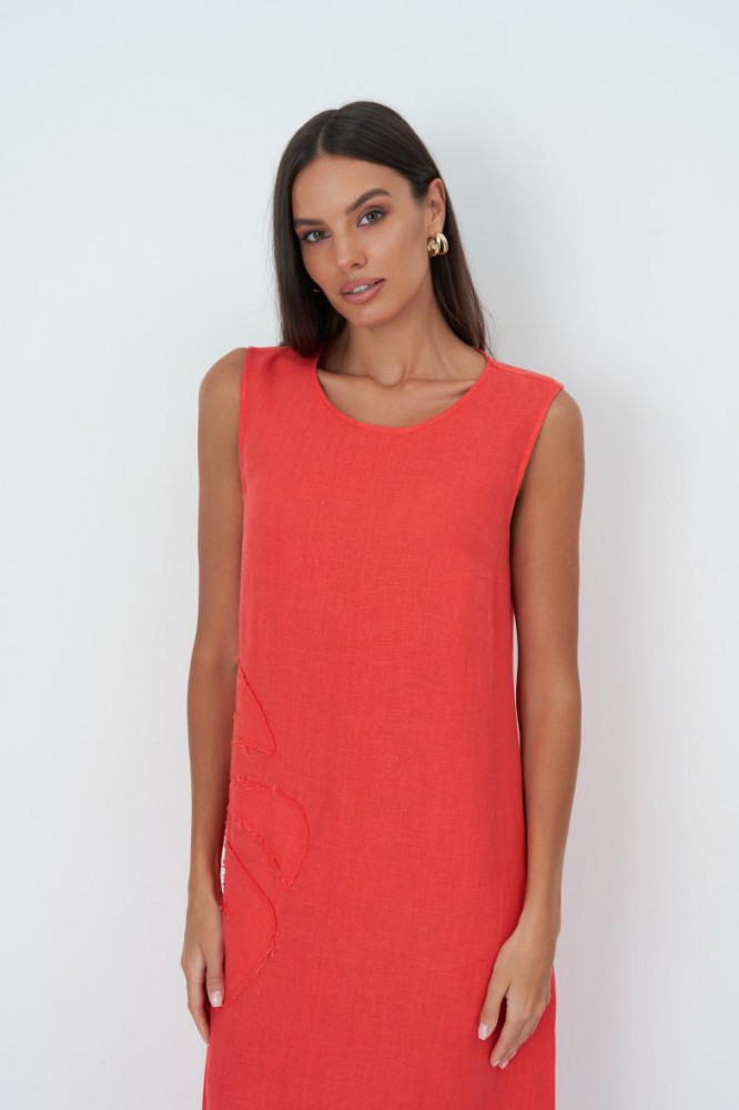 Длинный сарафан в свободном летнем фасоне выглядит воздушно и создаёт нежный очаровательный силуэт. Однотонная льняная ткань в трендовом цвете сезона, обеспечивает комфорт в жаркую погоду. Модный сарафан-платье без рукавов имеет круглый вырез горловины.