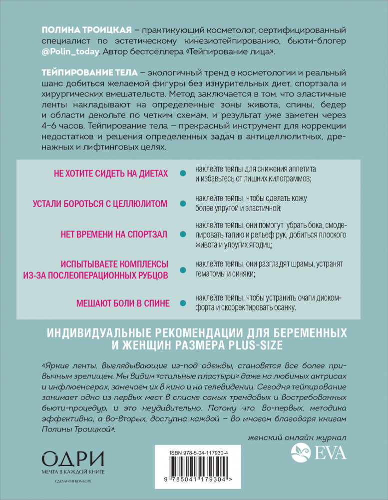Пора прекратить подвергать себя опасным диетам и испытывать дискомфорт от изнурительных тренировок в спортзале. В моде бережное отношение к себе и своему телу, а добиться фигуры своей мечты можно простым, но не менее эффективным способом. В книге косметолога Полины Троицкой вы найдете подробное руководство по использованию бесспорного тренда в косметологии — тейпирования тела в домашних условиях. Тейпирование уже помогло тысячам женщин в борьбе с нежеланными изменениями лица, а теперь станет вашим спасением и в борьбе с проблемными зонами тела. Более 50 аппликаций, а также онлайн-уроки, на которые можно перейти через QR-коды в книге, помогут избавиться от лишних сантиметров в талии и подтянуть ягодицы, устранят ненавистный целлюлит и варикозные звездочки, скорректируют осанку и даже уменьшат менструальную боль.Наносите на тело яркие эластичные ленты, следуя рекомендациям из книги. Они будут работать пока вы спите, и не создавать дискомфорта в течение дня. Это просто, легко, эффективно и безопасно! |