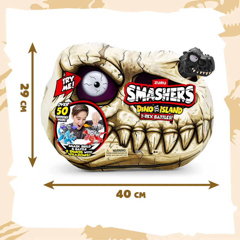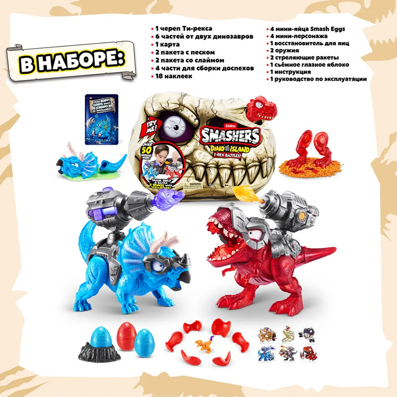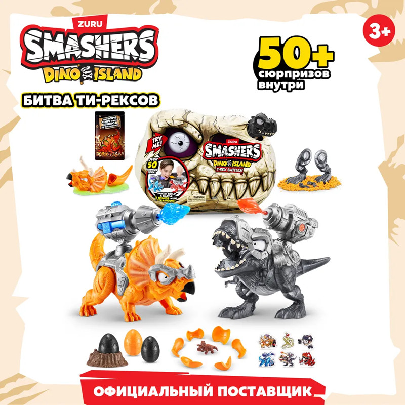 В данный момент этот товар отсутствует в продаже. Возможно, у нас найдется аналогичный или похожий товар здесь. Серия: Smashers Вы готовы к доисторической битве? Тогда разбейте большой череп игрового набора Остров Динозавров Битва Ти-Рексов! Исследуйте удивительные находки и почувствуйте себя настоящим археологом. Копайтесь в песке и слизи, используя инструмент для раскопок, чтобы найти все части окаменелостей, а затем соберите их, чтобы оживить скелеты! Прикрепите к динозаврам оружие и доспехи для финальной битвы. Разбейте мини-яйца, чтобы отыскать коллекционных персонажей, поместите глазное яблоко в пасть рептилии, чтобы она заревела! В наборе Смэшерс Остров Динозавров Битва Ти-Рексов вас ждёт более 50 сюрпризов. Разбивайте, стройте и сражайтесь!