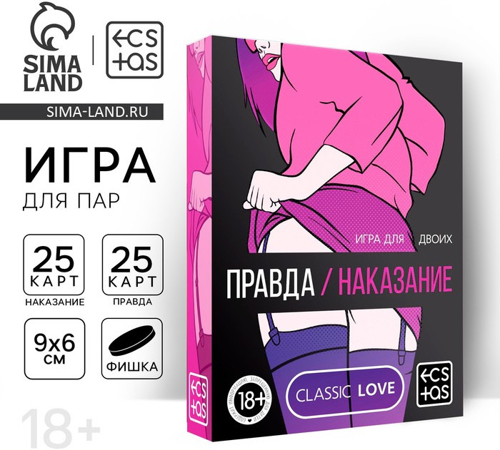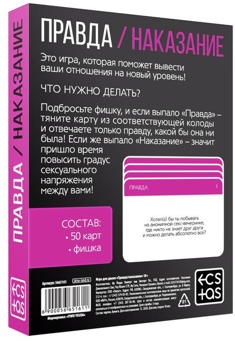 Серия: Новая классика Эротическая игра для двоих. Эта игра поможет вывести ваши отношения на новый уровень! Просто подбросьте фишку. Если выпала «Правда» — тяните карту из соответствующей колоды и отвечайте только правду, какой бы она ни была. Если же выпало «Наказание» — значит, пришло время повысить градус сексуального напряжения между вами! |