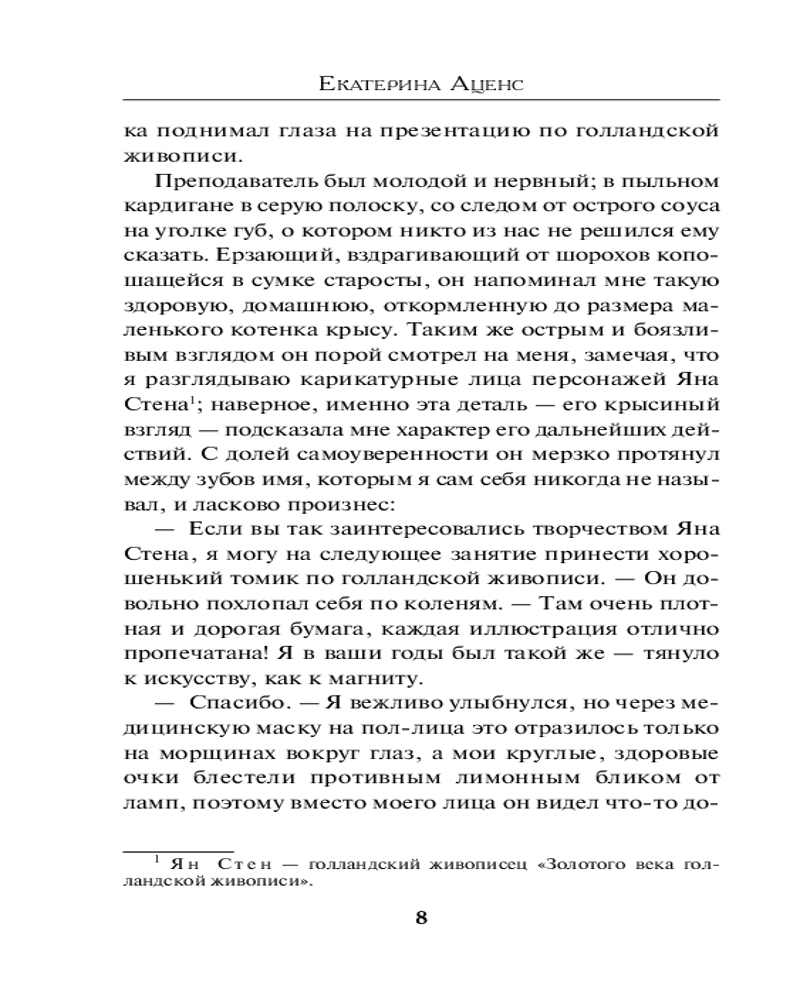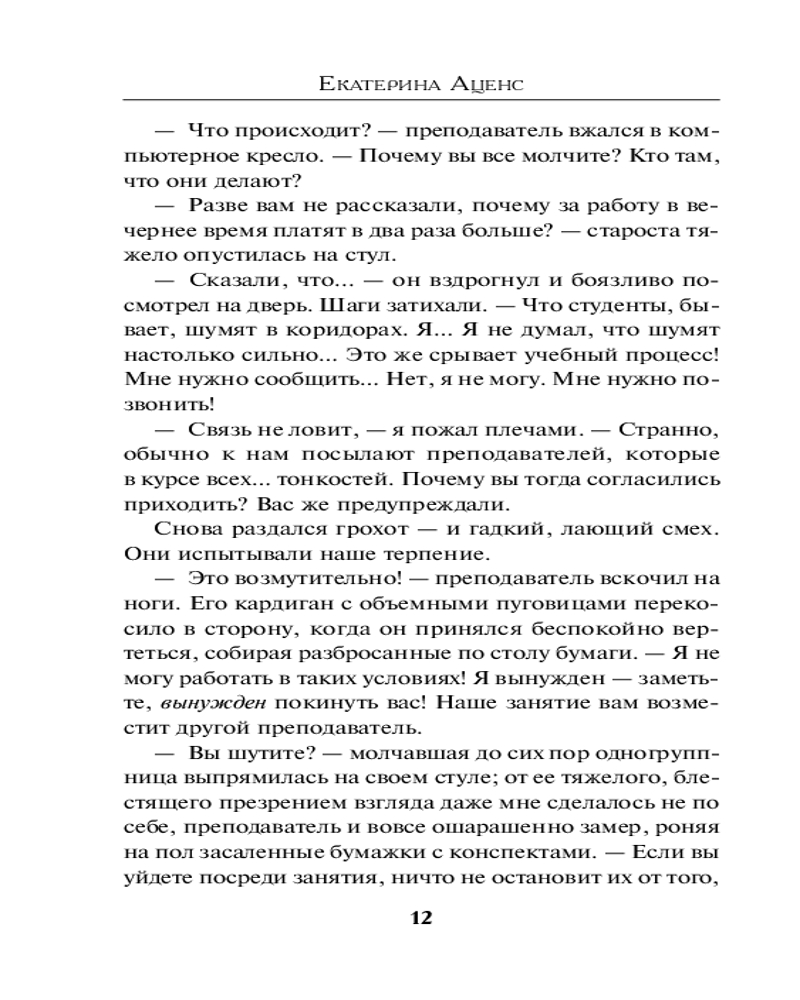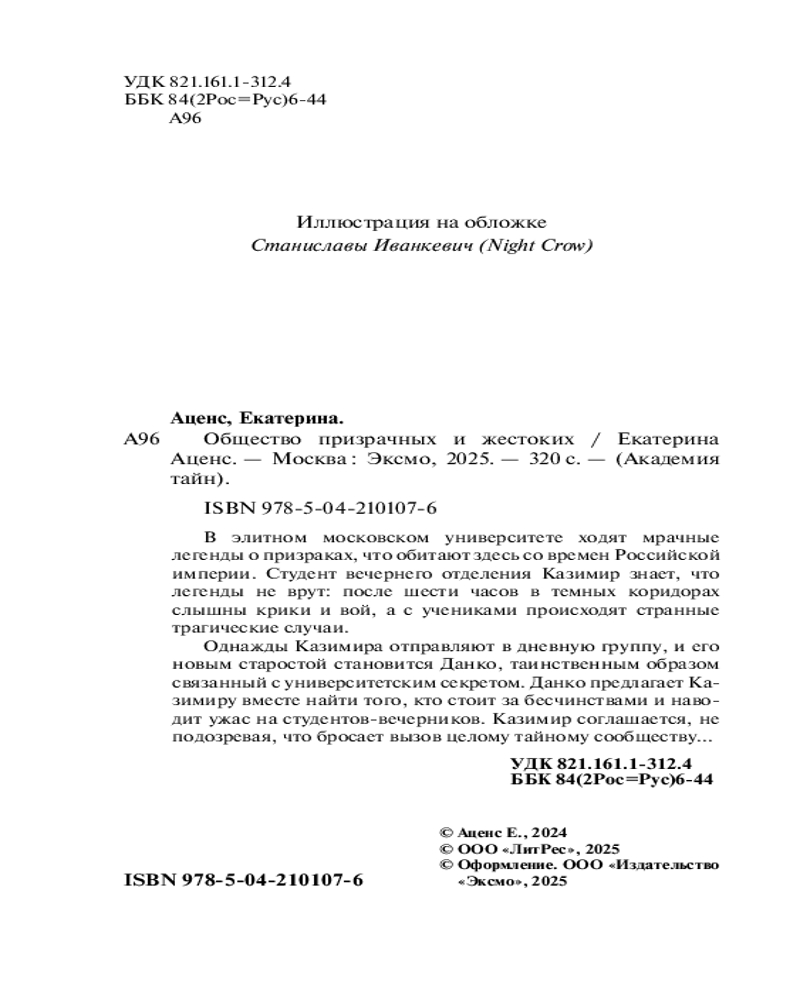 💳 Оплатить за товар можно при получении 🇰🇿 Есть бесплатная доставка по Казахстану 🎁 Копите бонусы с каждой покупки Серия: Академия тайн В элитном московском университете ходят мрачные легенды о призраках, что обитают здесь со времен Российской империи. Студент вечернего отделения Казимир знает, что легенды не врут: после шести часов в темных коридорах слышны крики и вой, а с учениками происходят странные трагические случаи. Однажды Казимира отправляют в дневную группу, и его новым старостой становится Данко, таинственным образом связанный с университетским секретом. Данко предлагает Казимиру вместе найти того, кто стоит за бесчинствами и наводит ужас на студентов-вечерников. Казимир соглашается, не подозревая, что бросает вызов целому тайному сообществу... |