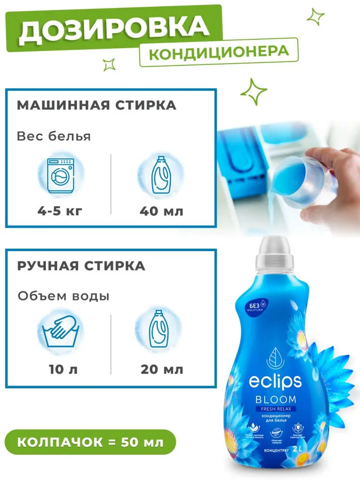 Способ применения: используйте согласно таблице. Дозируйте при помощи колпочка. Добавьте в отделение для кондиционера в стиральной машине. Добавьте в воду во время последнего полоскания при ручной стирке. Замочите белье в полученном растворе на 10 минут при ручной стирке. Перед применением взболтать!