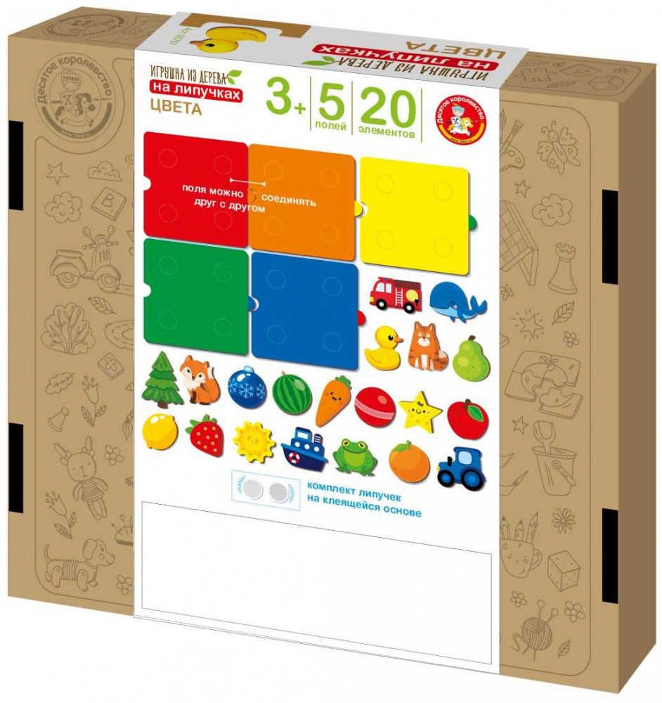 Как играть? В набор входят поля и объекты, которые крепятся с помощью липучек «велькро». Ребенок должен найти, какие объекты прикрепить к определенной карточке, и точно соединить липучки, чтобы фигурка крепко держалась на картинке. Поля можно соединять друг с другом. Собирая картинки, ребенок учится терпению, усидчивости, умению концентрировать внимание, доводить начатое дело до конца, сопоставлять цвета, разовьет мелкую моторику рук и наглядно-образное мышление. Подключитесь к игре, назовите ребенку используемые цвета, расскажите правила соединения карточек, попросите его собирать и называть цвета. После нескольких игр дети начинают замечать цвета вокруг себя: в одежде, на улице, в любимых игрушках. Это не просто знания — это новый способ видеть и понимать мир. Развивающая игра из дерева на липучках «Цвета» помимо мелкой моторики, развивает координацию движений, интеллект и память, внимание и усидчивость, учит сопоставлять объекты между собой, расширяет словарный запас.