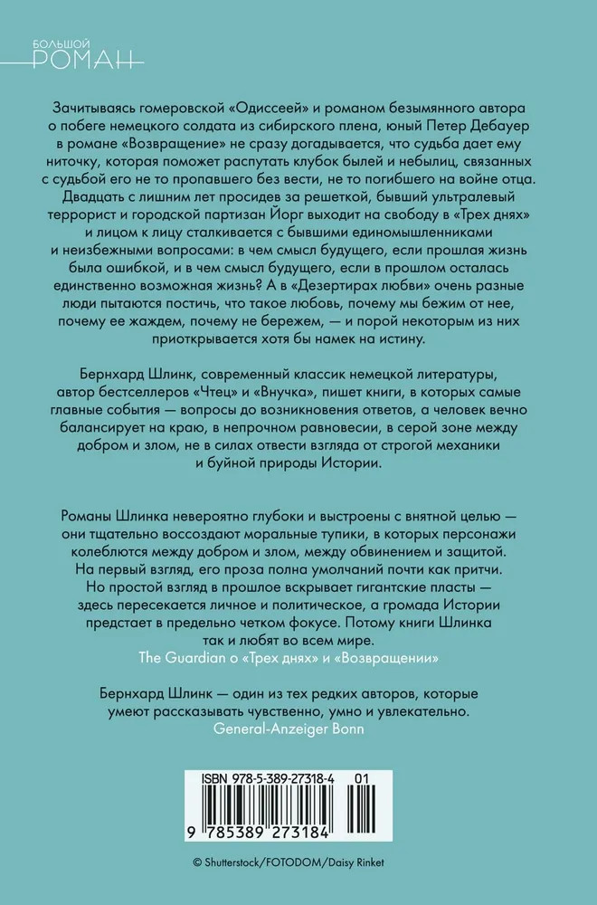 Серия: Большой роман Зачитываясь гомеровской «Одиссеей» и романом безымянного автора о побеге немецкого солдата из сибирского плена, юный Петер Дебауер не сразу догадывается, что судьба дает ему ниточку, которая поможет распутать клубок былей и небылиц, связанных с судьбой его не то пропавшего без вести, не то погибшего на войне отца. Двадцать с лишним лет просидев за решеткой, бывший ультралевый террорист и городской партизан Йорг выходит на свободу и лицом к лицу сталкивается с бывшими единомышленниками и неизбежными вопросами: в чем смысл будущего, если прошлая жизнь была ошибкой, и в чем смысл будущего, если в прошлом осталась единственно возможная жизнь? Очень разные люди пытаются постичь, что такое любовь, почему мы бежим от нее, почему ее жаждем, почему не бережем — и порой некоторым из них приоткрывается хотя бы намек на истину. Шлинк пишет книги, в которых самые главные события — вопросы до возникновения ответов, а человек вечно балансирует на краю, в непрочном равновесии, в серой зоне между добром и злом, не в силах отвести взгляда от строгой механики и буйной природы Истории. |