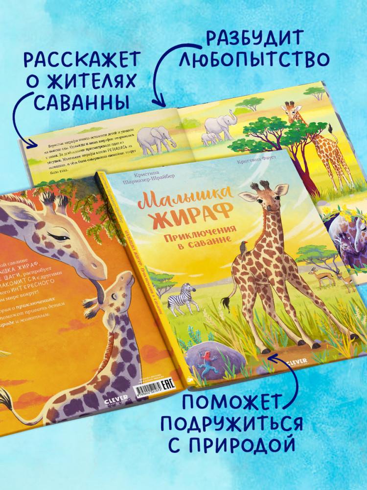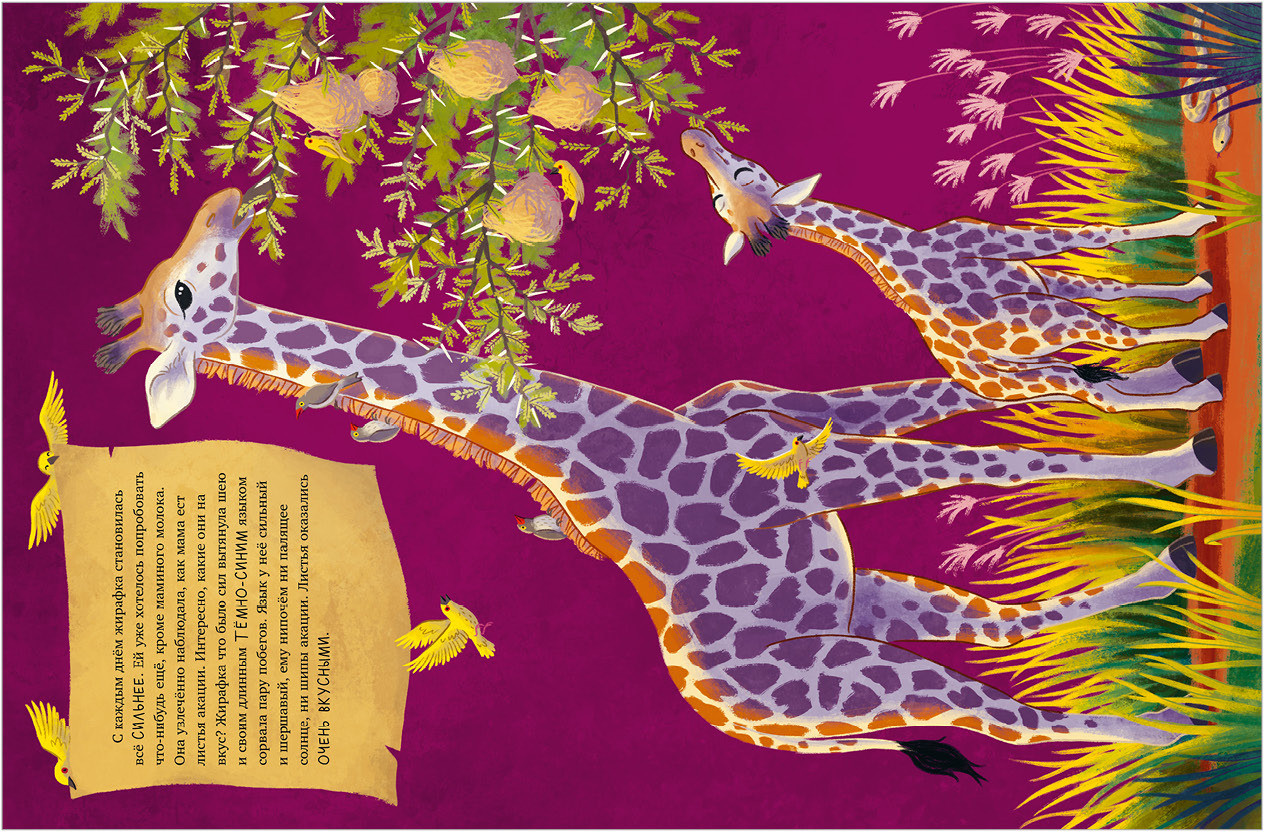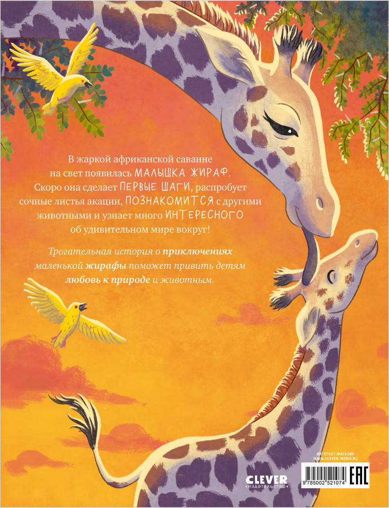 В жаркой африканской саванне на свет появилась малышка-жираф. Скоро она сделает первые шаги, распробует сочные листья акации, познакомится с другими животными, сделает много открытий и узнает все об удивительном мире вокруг! Книжка понравится малышам 2, 3, 4, 5 лет и научит любить природу, интересоваться окружающим миром, совершать открытия и быть любопытным.