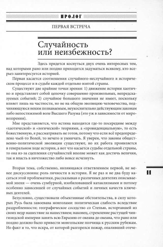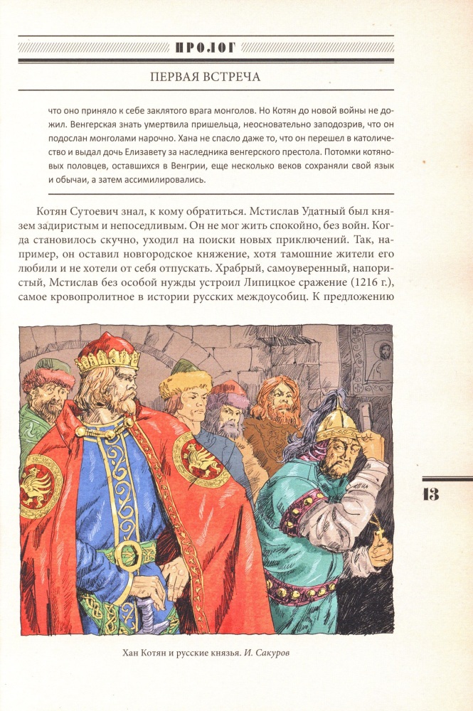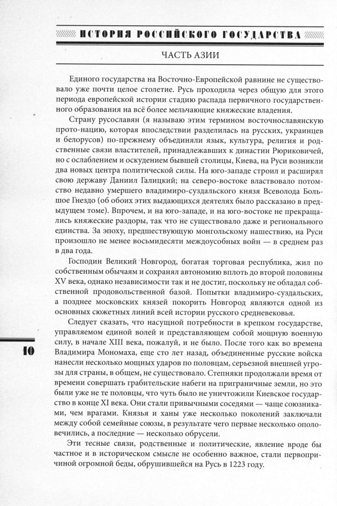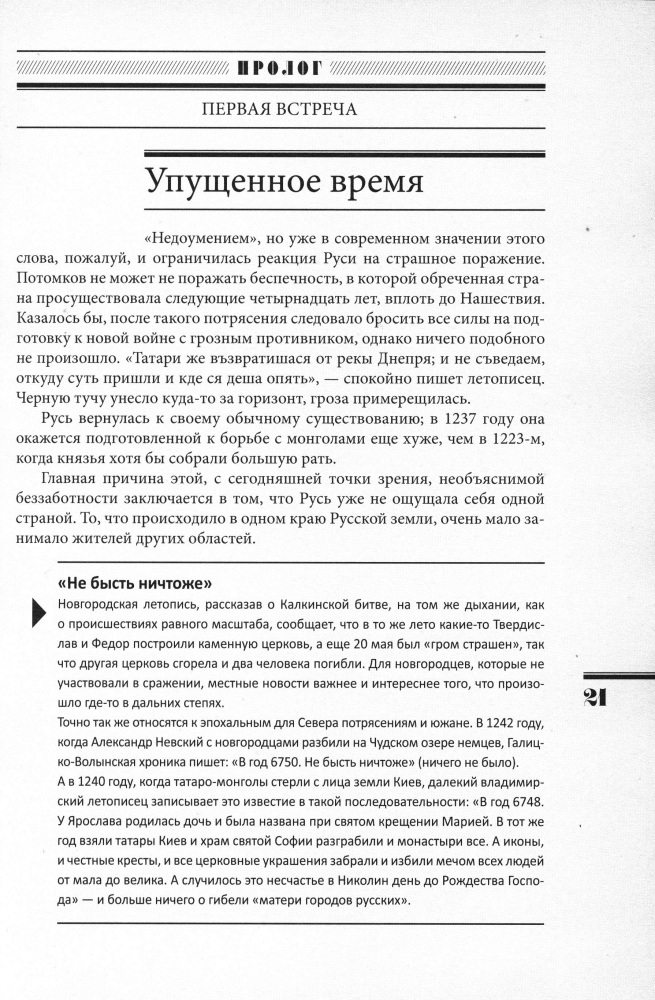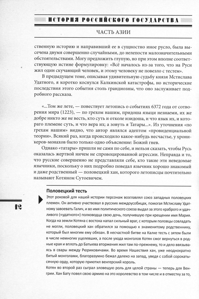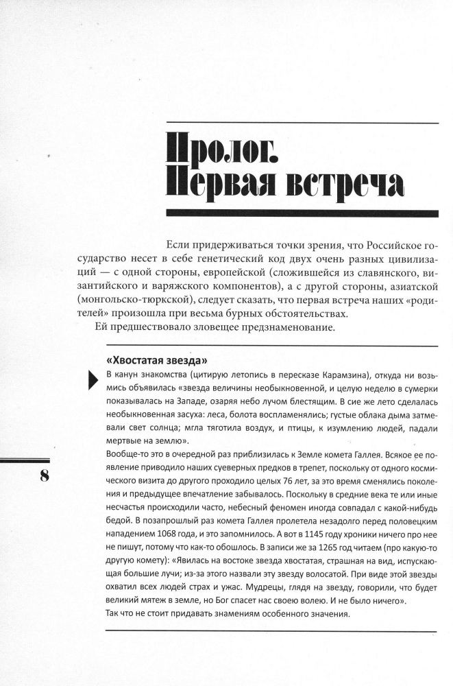 «В биографии всякой страны есть главы красивые, ласкающие национальное самолюбие, и некрасивые, которые хочется забыть или мифологизировать. Эпоха монгольского владычества в русской истории – самая неприглядная. Это тяжелая травма исторической памяти: времена унижения, распада, потери собственной государственности. Писать и читать о событиях XIII-XV веков – занятие поначалу весьма депрессивное. Однако постепенно настроение меняется. Процесс зарубцевания ран, возрождения волнует и завораживает. В нем есть нечто от русской сказки: Русь окропили мертвой водой, затем живой – и она воскресла, да стала сильнее прежнего. Татаро-монгольское завоевание принесло много бед и страданий, но в то же время оно продемонстрировало жизнеспособность страны, которая выдержала ужасное испытание и сумела создать новую государственность вместо прежней, погибшей».