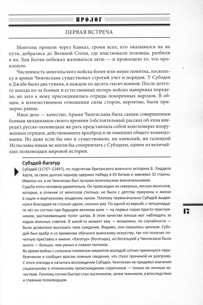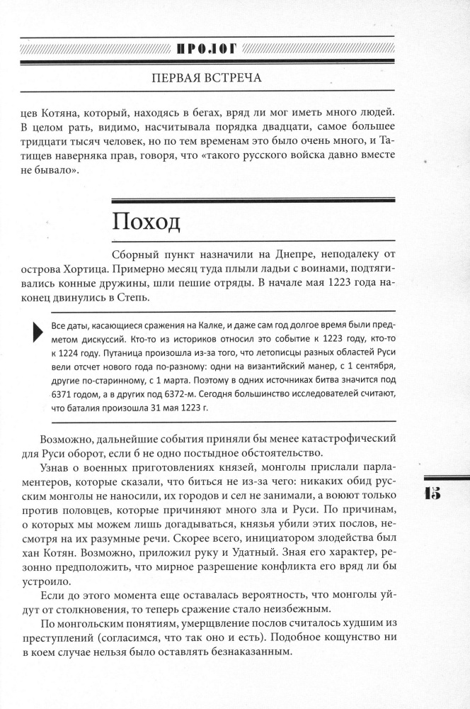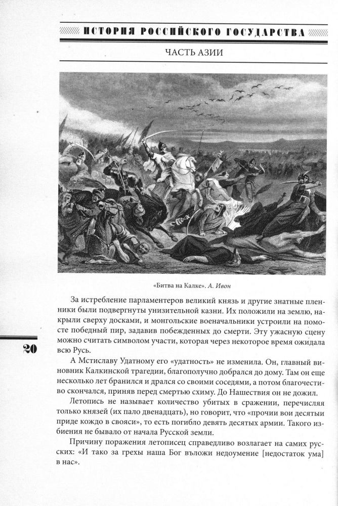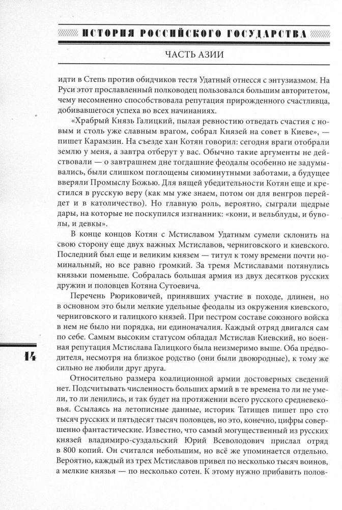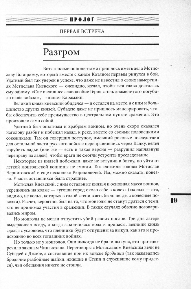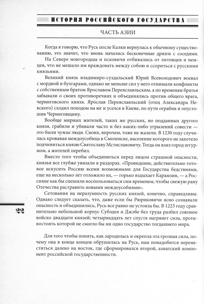 «В биографии всякой страны есть главы красивые, ласкающие национальное самолюбие, и некрасивые, которые хочется забыть или мифологизировать. Эпоха монгольского владычества в русской истории – самая неприглядная. Это тяжелая травма исторической памяти: времена унижения, распада, потери собственной государственности. Писать и читать о событиях XIII-XV веков – занятие поначалу весьма депрессивное. Однако постепенно настроение меняется. Процесс зарубцевания ран, возрождения волнует и завораживает. В нем есть нечто от русской сказки: Русь окропили мертвой водой, затем живой – и она воскресла, да стала сильнее прежнего. Татаро-монгольское завоевание принесло много бед и страданий, но в то же время оно продемонстрировало жизнеспособность страны, которая выдержала ужасное испытание и сумела создать новую государственность вместо прежней, погибшей».