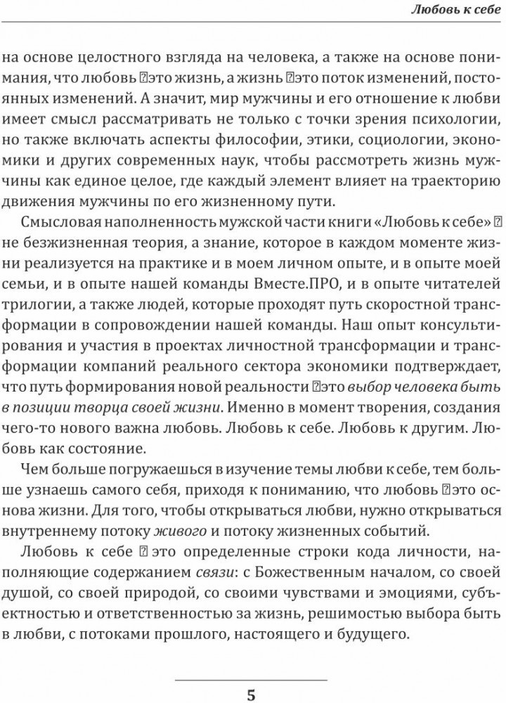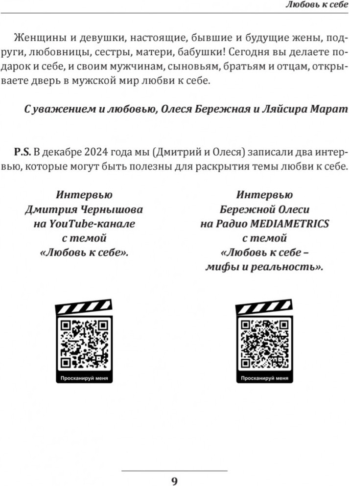 Книга «Любовь к себе» — уникальная книга, которая написана на двух языках на «женском» и «мужском» в усилении и дополнении друг друга. Ляйсира Марат честно и открыто раскрывает детали собственного пути в любовь к себе. Совместно с Дмитрием и Олесей описывают трансформацию состояния «Любовь к себе», а также глубокое исследование мужского взгляда на мир "Любовь к себе«. |