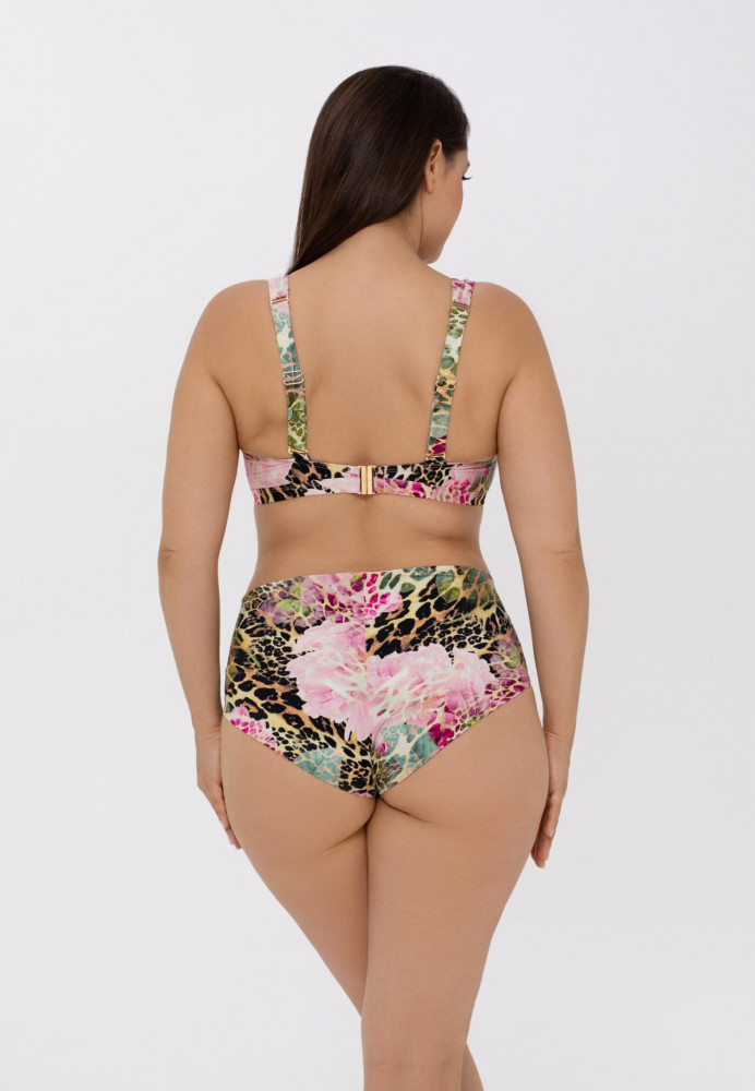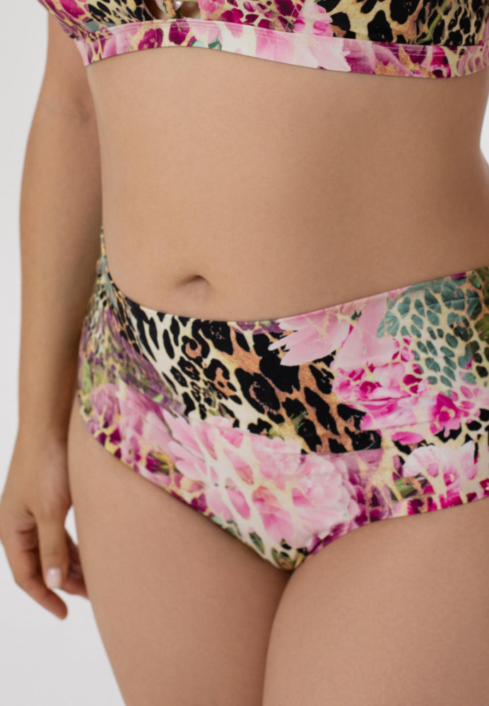В многослойной композиции эксклюзивного принта тропические цветы изящно переплетаются с леопардовым мотивом. Гармоничный ансамбль из романтических розовых и лазурных, искрящихся желтых и зеленых оттенков дополняют нежные перламутровые аксессуары. Еще большему очарованию способствует ультрагладкая поверхность ткани и высококачественная печать с высоким разрешением. Можно ли через цвет передать настроение отпуска? Наш ответ — да! Плавки женские-бразилиана с завышенной линией талии. Высота пояса регулируется за счет широкого пояса — отворота.