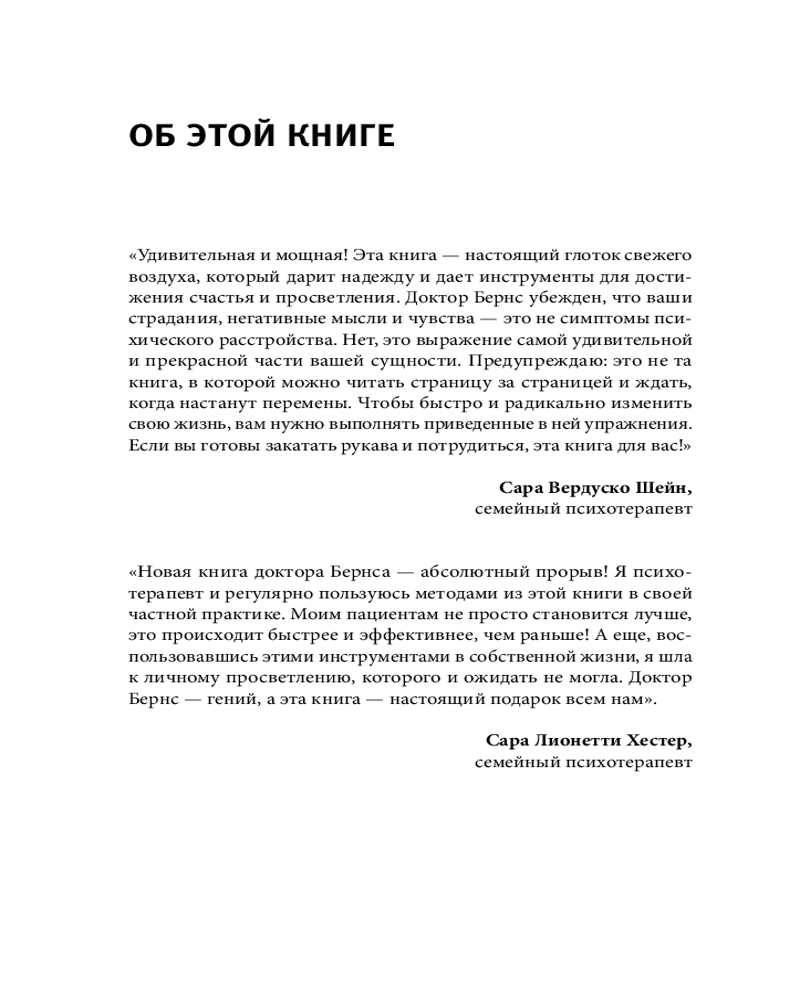 Дэвид Бернс — американский психиатр, заслуженный ученый, преподаватель, автор мировых бестселлеров, популяризатор когнитивно-поведенческой терапии. Перед вами самое последнее, дополненное издание классической работы Дэвида Бернса, основанное на новейших исследованиях в области психологии. В книге более 50 техник, с помощью которых вы сможете побороть негативные мысли и вызванные ими тревогу и подавленное настроение. Новые методы помогут развить чувство радости и позитивное отношение к себе и к жизни.