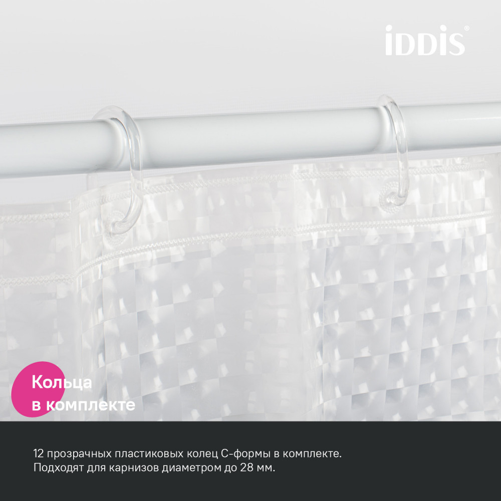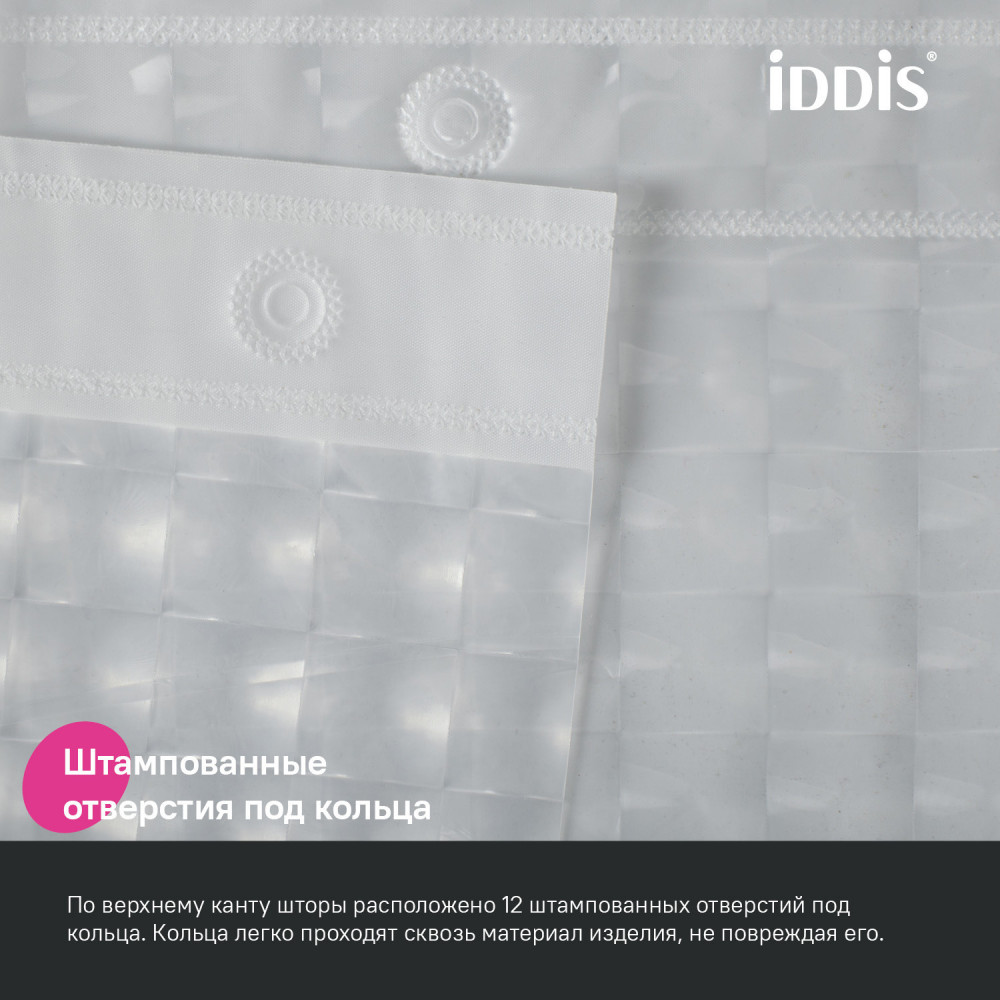 Полупрозрачная 3D-штора для ванной с рисунком из маленьких квадратов. Изготовлена из современного материала PEVA — мягкого, приятного на ощупь, экологичного и безвредного для здоровья термопластика (толщина 0.13 мм).