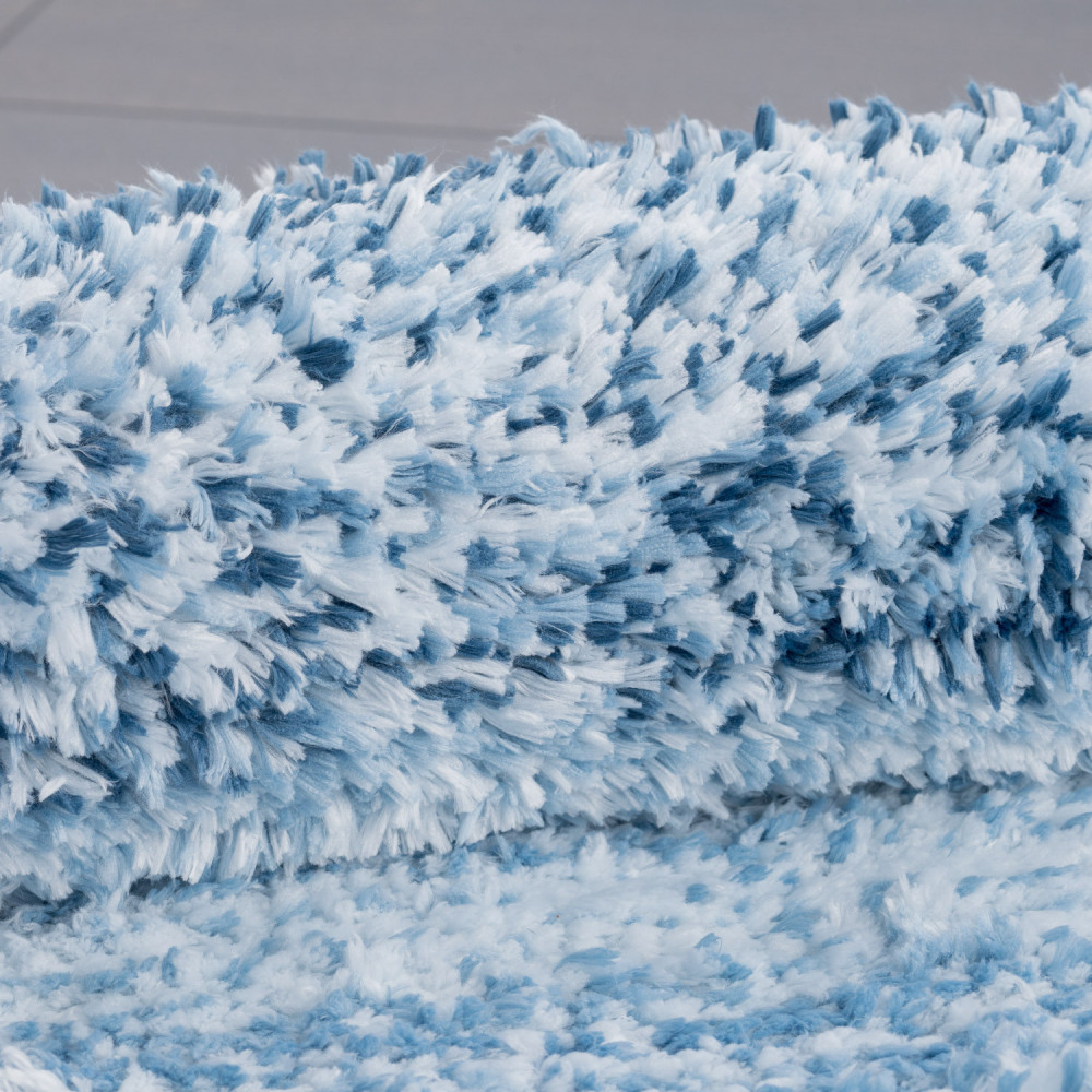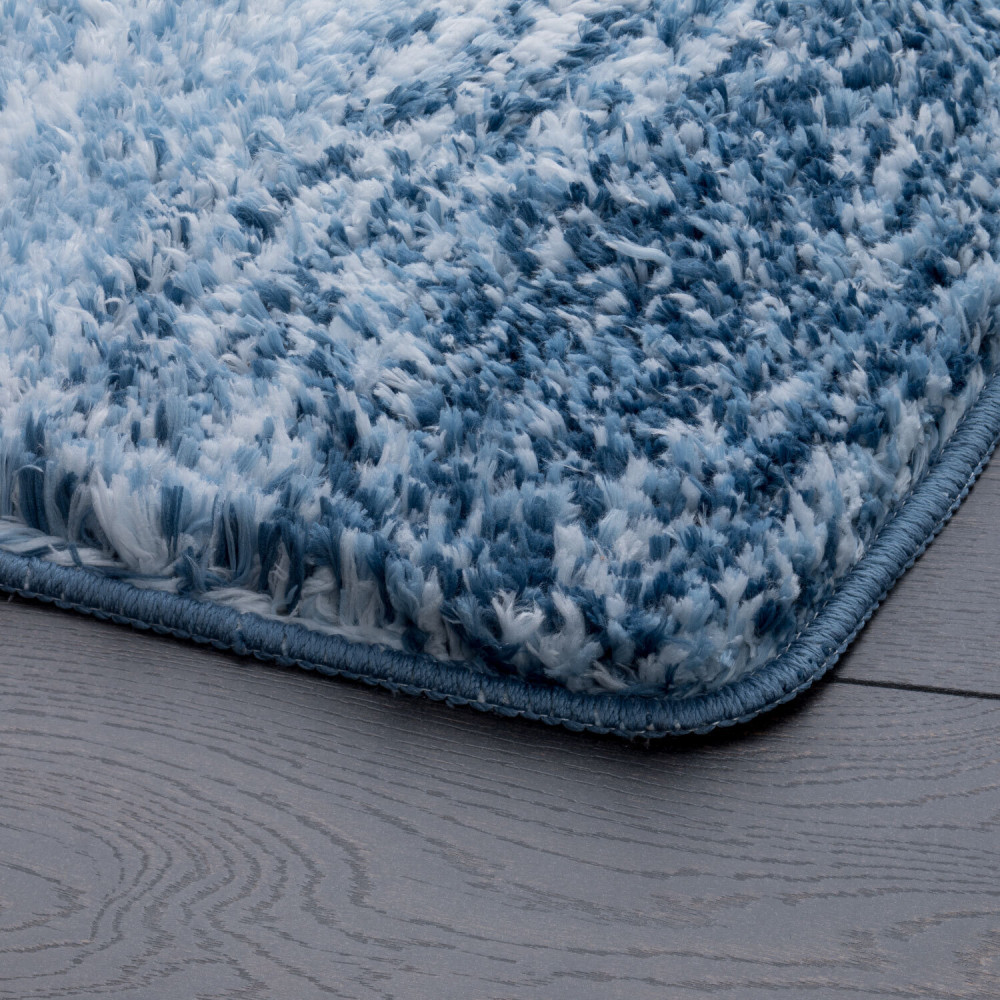 Пушистый коврик для ванной синего цвета с высоким плотным ворсом (2,5 см), мягкий и очень приятный на ощупь. Ворс из полиэстера отлично держит форму, легко чистится и быстро сохнет.