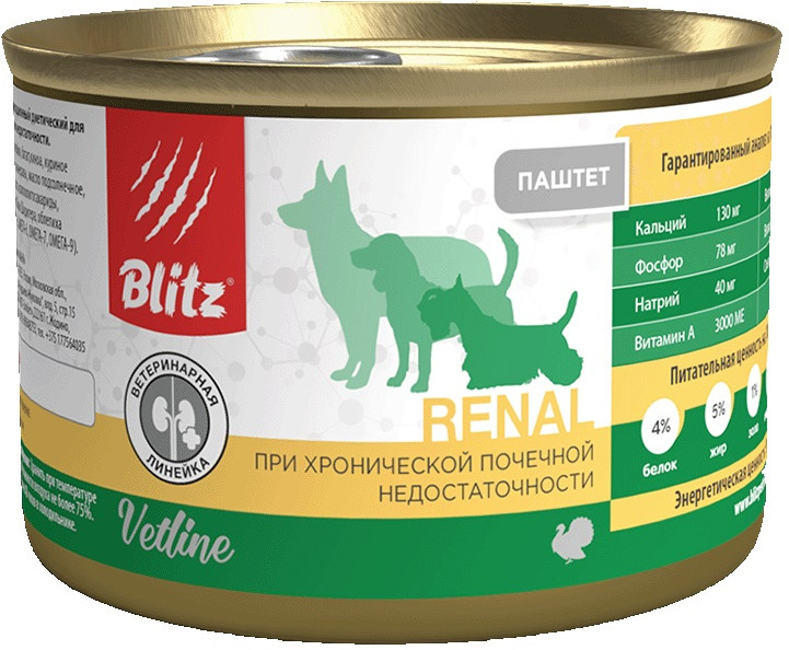 Корм консервированный Blitz Vetline Renal полнорационный диетический для собак при хронической почечной недостаточности. Ветеринарная диета при хронической почечной недостаточности, способствующая замедлению прогрессирования ХПН у собак. Диетический влажный корм Blitz Dog Renal ориентирован на кормление взрослых собак, страдающих хронической почечной недостаточностью — ХПН. Рецептура учитывает ветеринарные показания и специфику течения данного заболевания. Он призван накормить питомца, не влияя при этом на функциональную нагрузку почечных нефронов.