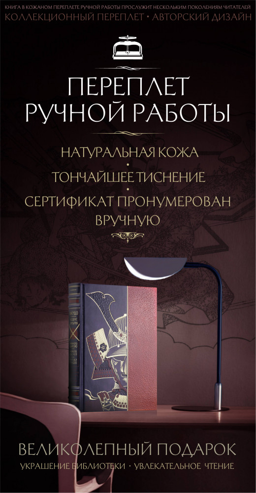 «Кодекс самурая. Хагакурэ Бусидо. Книга Пяти Колец». Книга в коллекционном кожаном переплёте ручной работыИнадзо Нитобэ, Ямамото Цунэтомо, Мусаси Миямото В данный момент этот товар отсутствует в продаже. Возможно, у нас найдется аналогичный или похожий товар здесь. Серия: Дорогие книги. Эксклюзив. Коллекция «Искусство войны» Книга в коллекционном инкрустированном переплете ручной работы, изготовленном по технологиям XIX века из гладкой кожи натурального дубления, украшенном изящным многоуровневым тиснением по авторским рисункам, созданным специально для этого издания. Обрез окрашен. Каптал и ляссе (ленточка для закладывания страниц) изготовлены из шелка. Бумага в книге легкая, матовая. Более 100 редких графических иллюстраций в тексте. Книга в переплете ручной работы будет великолепно смотреться на любой полке и украсит собой интерьер кабинета и библиотеки. Сертификат, подтверждающий уникальность коллекционного переплета, находится в каждом экземпляре, он пронумерован вручную. |