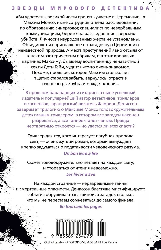 Серия: Звезды мирового детектива Максим Монсо, ныне сотрудник отдела расследований, по образованию синерголог, специалист по невербальным коммуникациям, берется за расследование зверских убийств. Личности изуродованных жертв не установлены. Объединяет их приглашение на загадочную Церемонию неизвестной природы. А места преступлений явно отсылают к неким эзотерическим обрядам, и в этих кровавых картинах Максиму, бывшему воспитаннику ненавистной секты Дети Гайи, чудится что-то очень знакомое. Кроме того, за Максимом по пятам постоянно следует неизвестный, а какой-то аноним шлет письма с невнятными угрозами. Похоже, прошлое, которое Максим столько лет тщетно старался забыть, вернулось, отрастив очень острые зубы, и жаждет крови... В прошлом барабанщик и гитарист, а ныне успешный издатель и популярнейший автор детективов, триллеров и саспенсов, французский писатель Флориан Дениссон завершает трилогию о Максиме Монсо головокружительным детективным триллером, в котором все загадки наконец разрешатся, а все тайное станет явным. Правда неотвратимо откроется — но удастся ли всех спасти? |