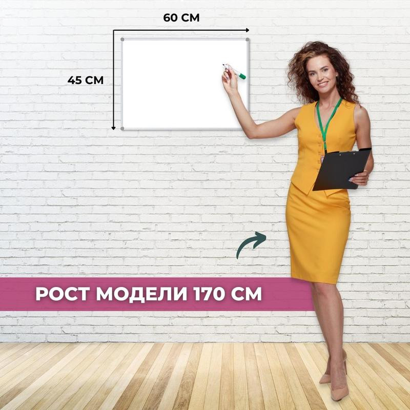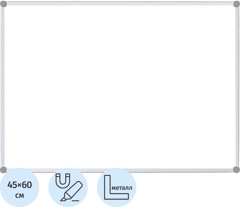 Доска магнитно—маркерная Attache Economy 45×60 см, настенная, с лаковым покрытием, в алюминиевом профиле. Комплектуется полочкой для маркеров. Для письма использовать специальные маркеры для магнитно—маркерных досок. Покрытие магнитно—маркерной доски имеет возможность крепления информации при помощи магнитов, при удалении записей используются только специальные губки-стиратели, в комбинации со специализированным спреем, для более тщательной очистки полотна. В комплект входят крепления, для размещения доски к стене. Возможность горизонтального и вертикального крепления. Ультратонкая конструкция: толщина центральной части — 3.5 мм, толщина доски по рамке — 6 мм, габаритная толщина по уголку — 11.5 мм. Глубина доски с рамой — 17 мм, без — 12–14 мм. Размер рабочей поверхности: 41×55 см. Рама снимается без повреждения доски.Для удаления пленки потяните за верхний свободный угол, пленка легко отойдет от рабочей поверхности. При необходимости проведите вдоль рамы канцелярским ножом.