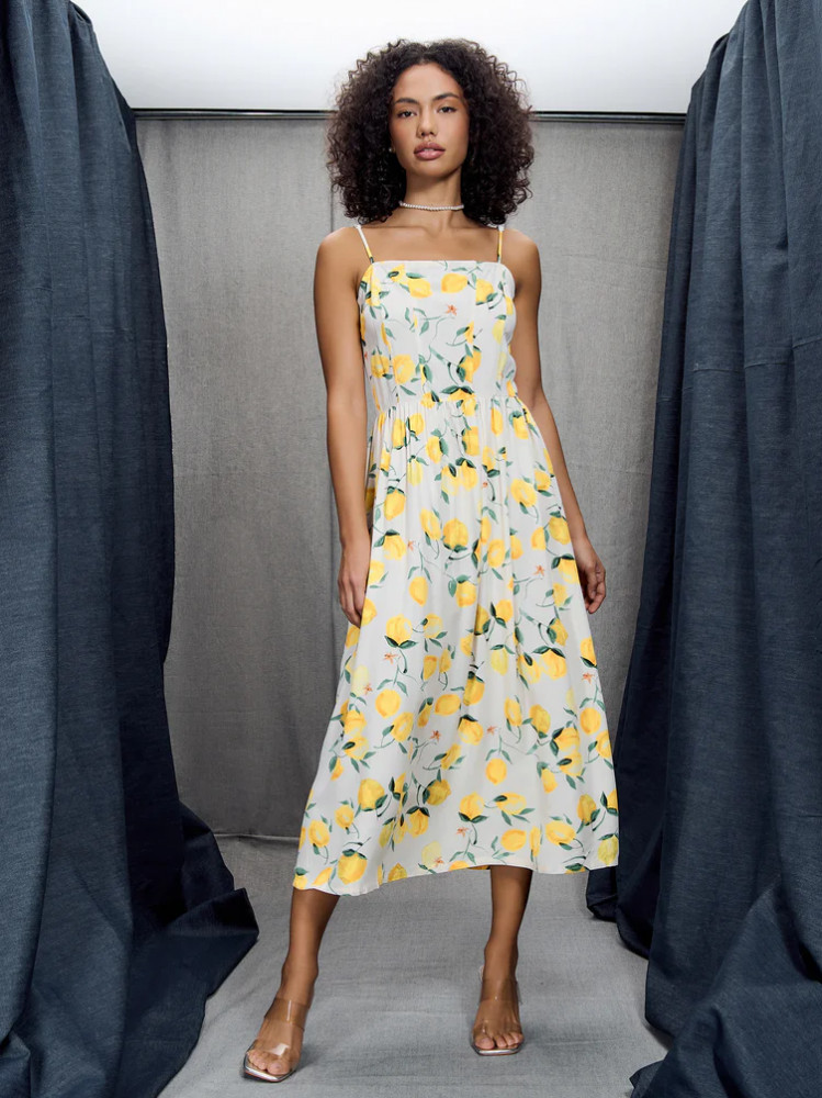 Этот очаровательный желтый сарафан — воплощение летнего настроения и женственности в современном исполнении. Игривый принт с лимонами на нежном желтом фоне создает свежий, запоминающийся образ, который поднимет настроение и подчеркнет вашу индивидуальность. Модель с открытыми плечами и тонкими регулируемыми бретелями идеально садится по фигуре благодаря полуприталенному силуэту и эластичной резинке на спине. Изготовленный из премиальной 100% вискозы, сарафан дарит непревзойденный комфорт и приятные тактильные ощущения при носке.