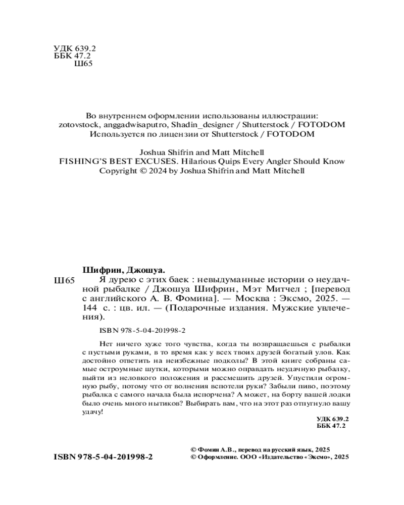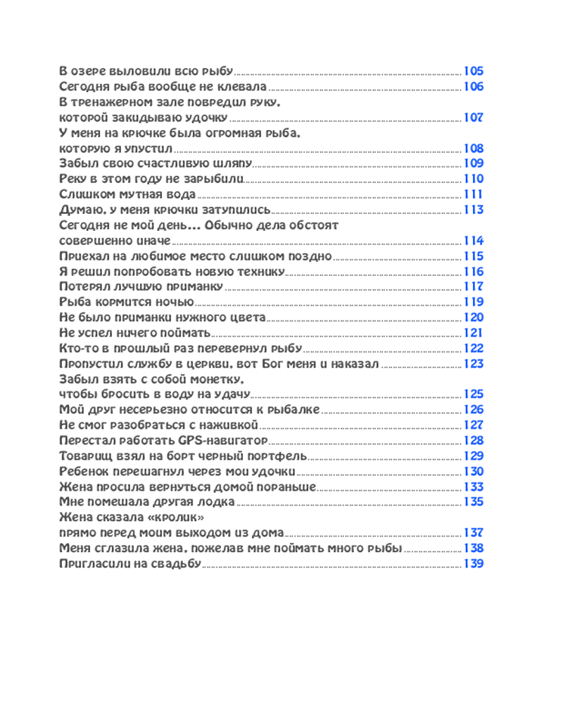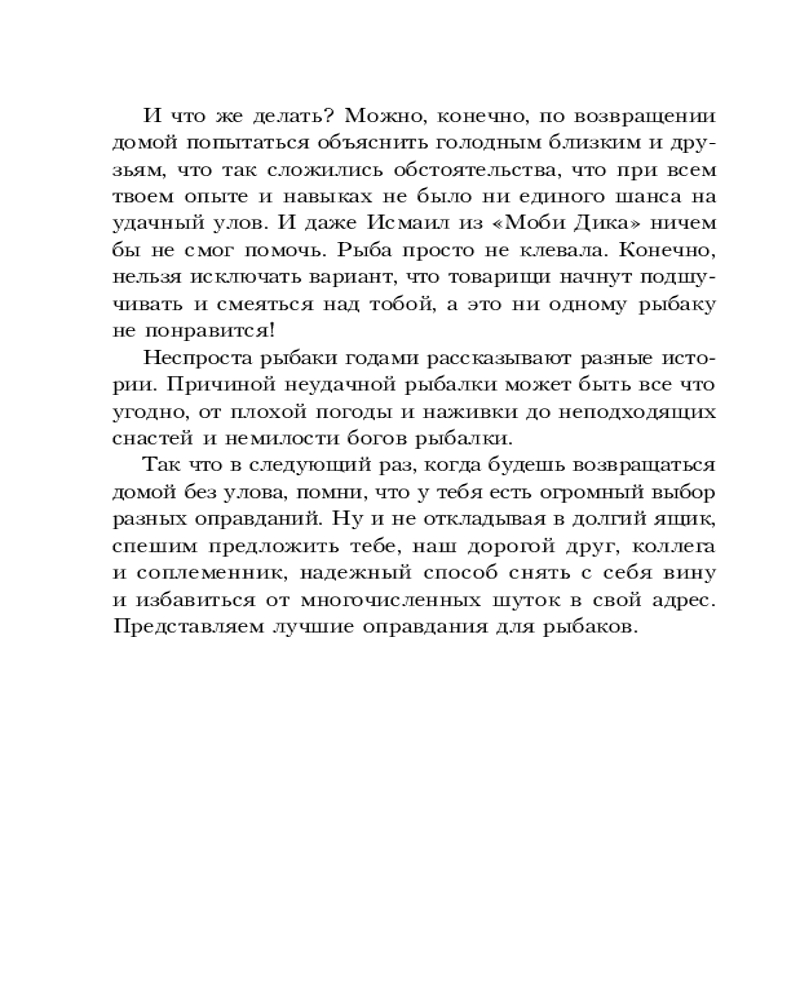 Серия: Подарочные издания. Мужские увлечения В жизни каждого рыбака бывают неудачные дни, когда не клюет — и все тут. Вдвойне обидно, если в это же время сосед ловит рыбу одну за другой, а тебе попадаются только старые башмаки! Как достойно ответить на неизбежные подколы друзей и близких и не упасть в грязь лицом окончательно? Эта книга поможет объяснить любую неудачу на рыбалке: будь то плохая погода, не та наживка, неисправная удочка или просто потому, что боги рыбалки на вас разгневались! В ней собраны самые остроумные шутки, которыми можно оправдать неудачную рыбалку, выйти из неловкого положения и рассмешить друзей. Упустили огромного карпа, потому что от волнения вспотели руки? Забыли пиво, поэтому рыбалка с самого начала не задалась? А может, на борту вашей лодки было много нытиков? Выбирать вам, что на этот раз отпугнуло вашу удачу! |
