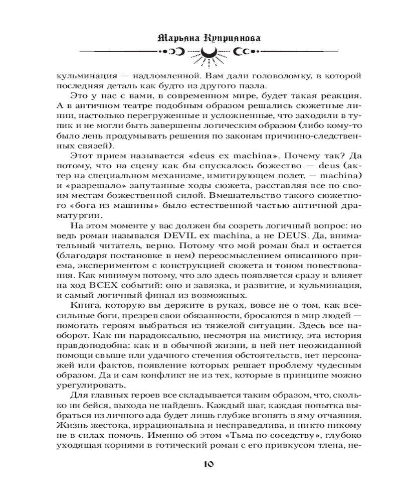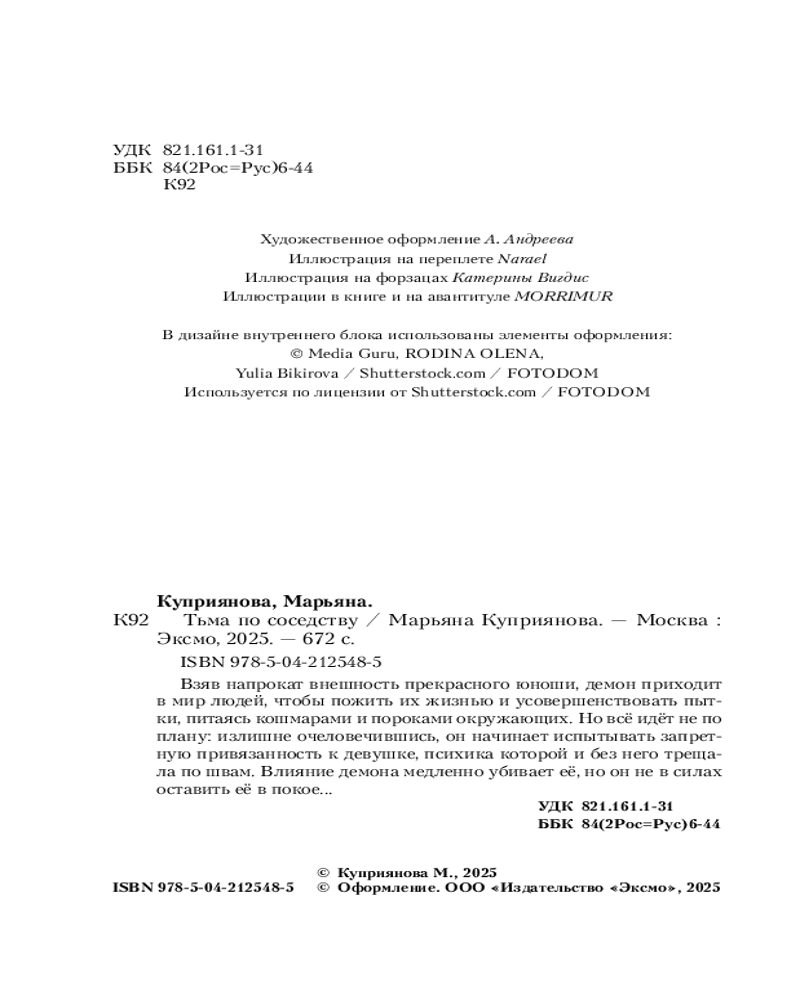 Тьма по соседствуВ данный момент этот товар отсутствует в продаже. Возможно, у нас найдется аналогичный или похожий товар здесь. Серия: Young Adult. Опасные игры Каково это, когда демон одержим тобой? Ей четко помнилось лишь одно: любовь — это всегда страдание. А вернее так: истинная любовь и истинное искусство зарождаются лишь в пепле из горестей и боли. Несчастье и сублимация несчастья. Всегда рука об руку. Взяв напрокат внешность прекрасного юноши, демон приходит в мир людей, чтобы пожить их жизнью и усовершенствовать пытки, питаясь кошмарами и пороками окружающих. Но всё идёт не по плану: излишне очеловечившись, он начинает испытывать запретную привязанность к девушке, психика которой и без него трещала по швам. Влияние демона медленно убивает её, но он не в силах оставить её в покое... |