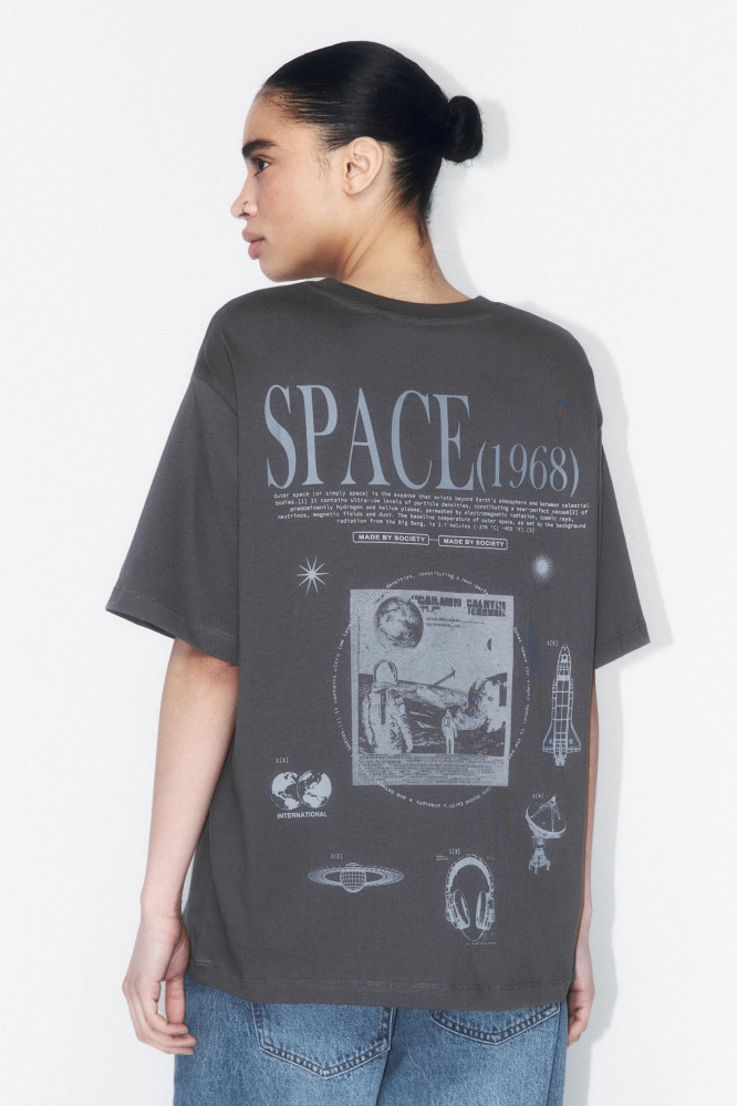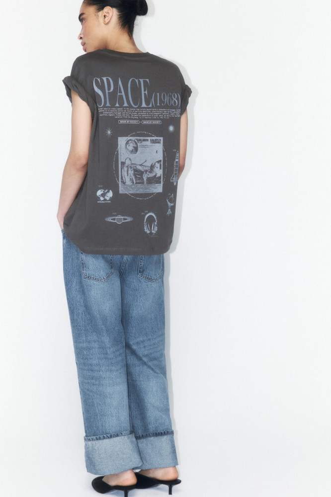Свободная дышащая футболка с принтом из новой коллекции внесет приятное разнообразие в аутфиты и гарантированно не оставит тебя без внимания. Носи хлопковую футболку с принтом с дерзким, рваным, объемным или наоборот подчеркивающим фигуру низом. Сочетай дышащую футболку из хлопка с разными фактурами. Добавь к образу массивную обувь, ремень, солнцезащитные очки из нулевых и создай стильный образ для рейв-вечеринки. Футболка с принтом — беспроигрышный вариант в клуб, на прогулку с друзьями и по другим особым поводам.