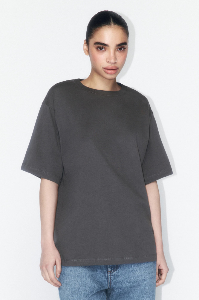 Удлиненная женская футболка свободного кроя oversize из легкой, дышащей, приятной к телу 100% хлопковой ткани высокой плотности с гладкой трикотажной фактурой. Круглый вырез горловины без воротника. Короткие свободные рукава со спущенной линией плеча. Прямой нижний край без разрезов и декоративных элементов.