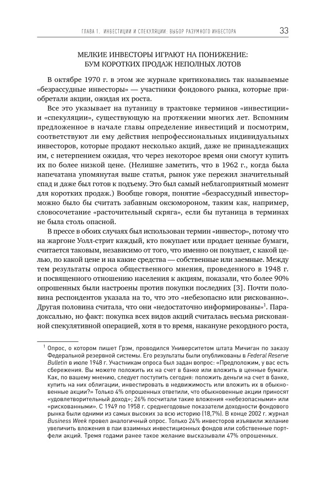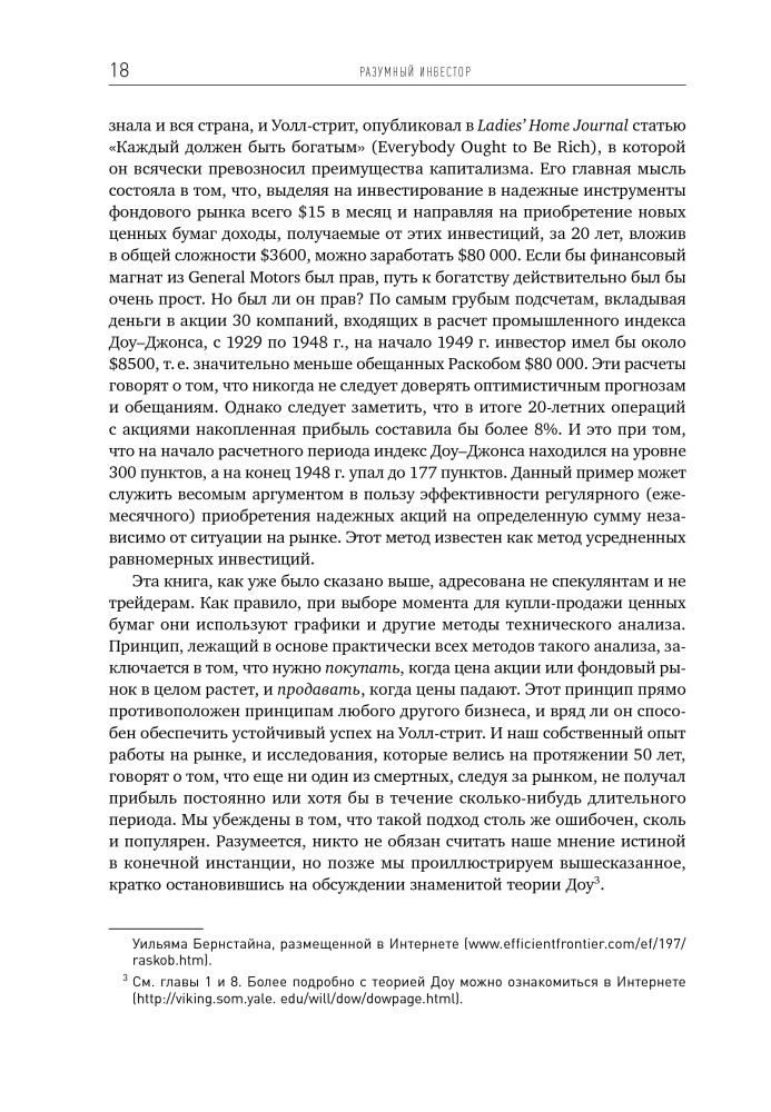 Серия: Финансы и торговля Есть старое доброе правило: не хочешь рисковать — довольствуйся скромными доходами. На нем обычно строится традиционная стратегия инвестиционной деятельности: уровень доходности вложений зависит от степени риска, который готов понести инвестор. Но мы с этим не согласны. С нашей точки зрения, доходность вложений должна зависеть от умственных усилий, которые инвестор прилагает для достижения своих целей. Бенджамин Грэм. |