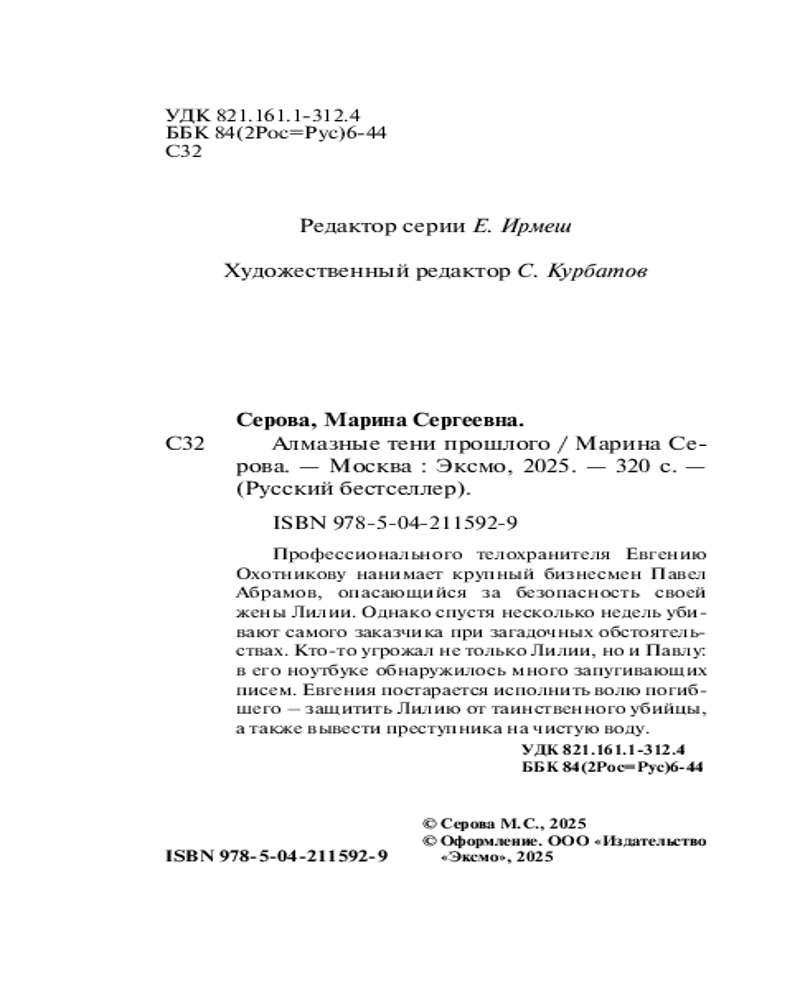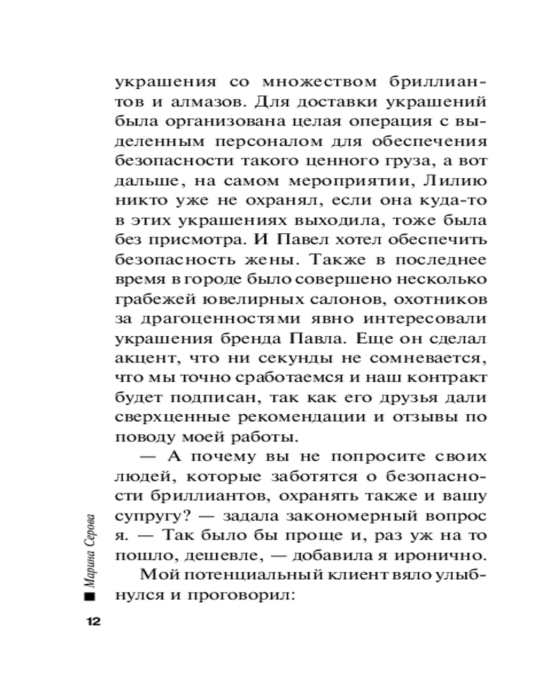 | Марина Сергеевна Серова — один из ведущих авторов серии современного русского детективного жанра (существует версия, что это коллектив авторов под общим руководством литературного агента Сергея Потапова). Согласно легенде, «выпускница юридического факультета МГУ, работала в Генеральной прокуратуре, сотрудница одной из спецслужб, участвовала в боевых операциях». Между тем написала 425 произведений размером порядка 200 страниц (и число их постоянно увеличивается). Часть произведений... |