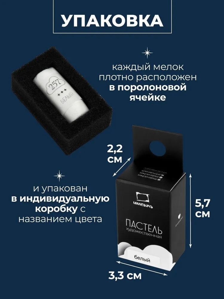 Пастель «Малевичъ» ручной работы, поэтому размер мелков может немного отличаться. Пастельные мелки для рисования имеют круглое сечение, упакованы в прочную картонную коробку, внутри поролон с нишей. На каждом мелке указана степень светостойкости. Для работы рекомендуем использовать готовую тонированную пастельную бумагу или затонировать самостоятельно акварелью или гуашью. Тонировка позволяет не покрывать цветом всю поверхность, что дает возможность экономить цвет и придавать работе непринужденную воздушность, легкость и глубину.
