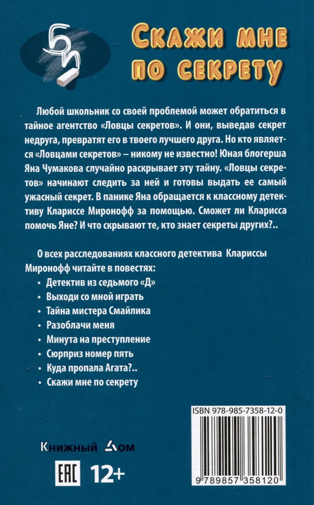Серия: Большая перемена Любой школьник со своей проблемой может обратиться в тайное агентство «Ловцы секретов». И они, выведав секрет недруга, превратят его в твоего лучшего друга. Но кто является «Ловцами секретов» — никому не известно! Юная блогерша Яна Чумакова случайно раскрывает эту тайну. «Ловцы секретов» начинают следить за ней и готовы выдать ее самый ужасный секрет. В панике Яна обращается к классному детективу Клариссе Миронофф за помощью! Сможет ли Кларисса помочь Яне? И что скрывают те, кто знает секреты других?... |