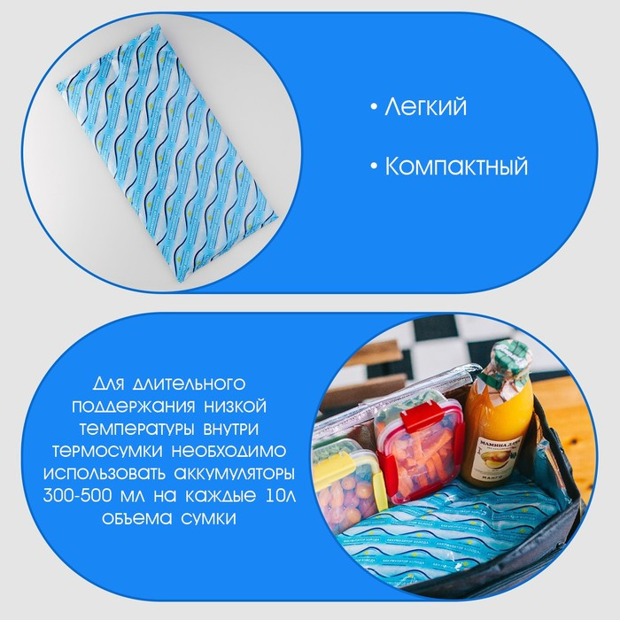 Мастер К Аккумулятор холода для термосумкиВ данный момент этот товар отсутствует в продаже. Возможно, у нас найдется аналогичный или похожий товар здесь. Аккумулятор холода — это герметичный контейнер с теплоёмким гелевым раствором. Аккумулятор холода предназначен для поддержания низкой температуры в контейнерах из вспененных материалов, сумках-холодильниках и термопакетах. Он равномерно распределяет холод внутри термосумки, не протекает, обеспечивает долговременное охлаждение продуктов. Положите резервуар в морозильную камеру до полного затвердевания (рекомендуется на 10–12 часов). Там изделие запасётся необходимым количеством холода, которое затем передаётся продуктам. После использования ополосните контейнер водой и протрите насухо. Храните изделие в морозильной камере или в другом сухом месте. Изготовлено из безвредных материалов. Предназначено для многократного использования (при условии сохранения непроницаемости корпуса). Подходит для любого вида продуктов. Срок эксплуатации не ограничен (при условии, что герметичность оболочки не нарушена). |