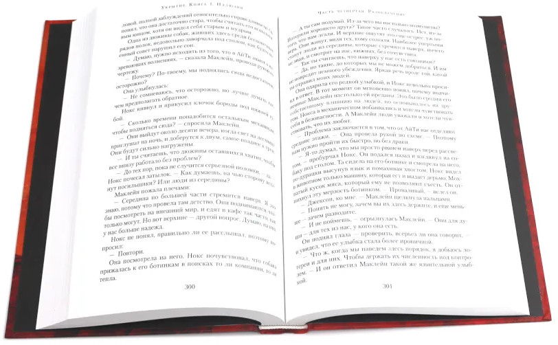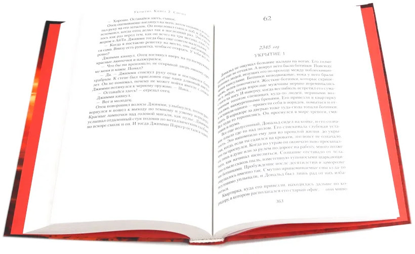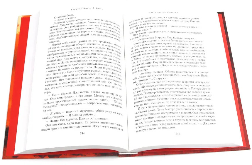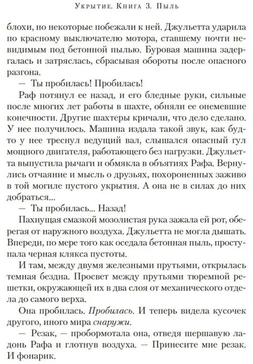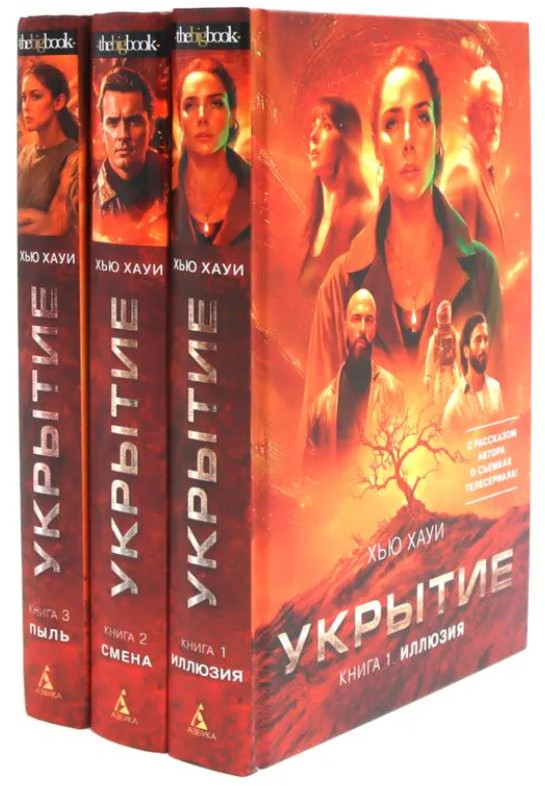 «Иллюзия», первая книга трилогии, представила читателям мир, созданный из подземных укрытий, и атмосферу в них. Вторая, «Смена», рассказала историю создания этих сооружений. «Пыль», книга, завершающая трилогию, расскажет об их падении. Чтобы начался новый мир, старый мир должен пасть. Джульетта, ныне мэр Восемнадцатого укрытия, не доверяет Первому укрытию, откуда ведется управление остальными. Особо ей ненавистен руководитель Первого Дональд. Но в мире, который состоит из укрытий, нет черного и белого — все здесь в оттенках серого. И возможно, Дональд не страшное бессердечное чудовище, каким его представляет Джульетта, а тот самый счастливый шанс на пути к выживанию человечества. В мае 2023 года состоялась премьера первого сезона телесериала «Укрытие», снятого по роману Хауи (режиссеры Адам Бернштейн и Мортен Тильдум по сценарию Грэма Йоста). Сериал пользовался огромной популярностью, получил высокие рейтинги и уже продлен на второй и третий сезоны. |