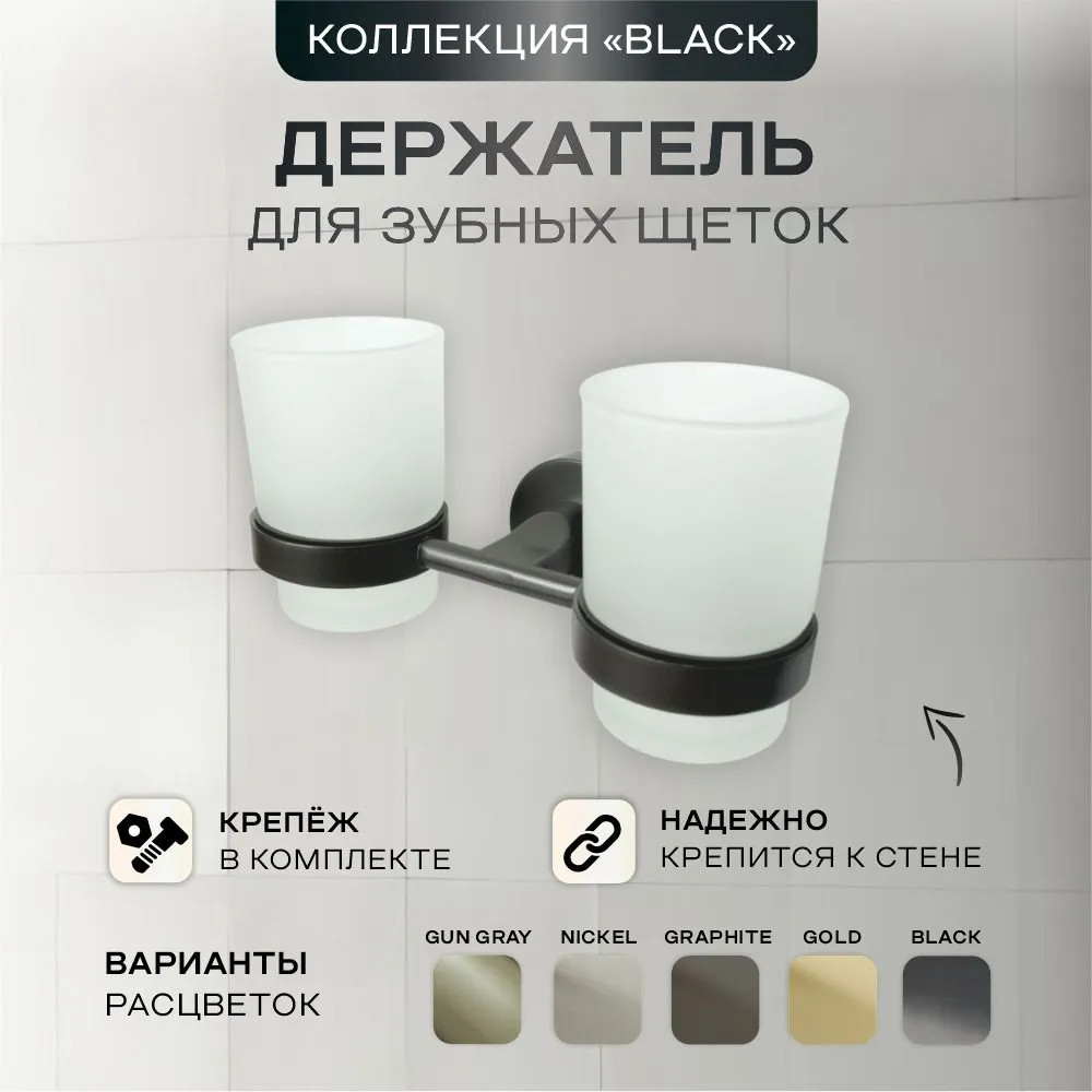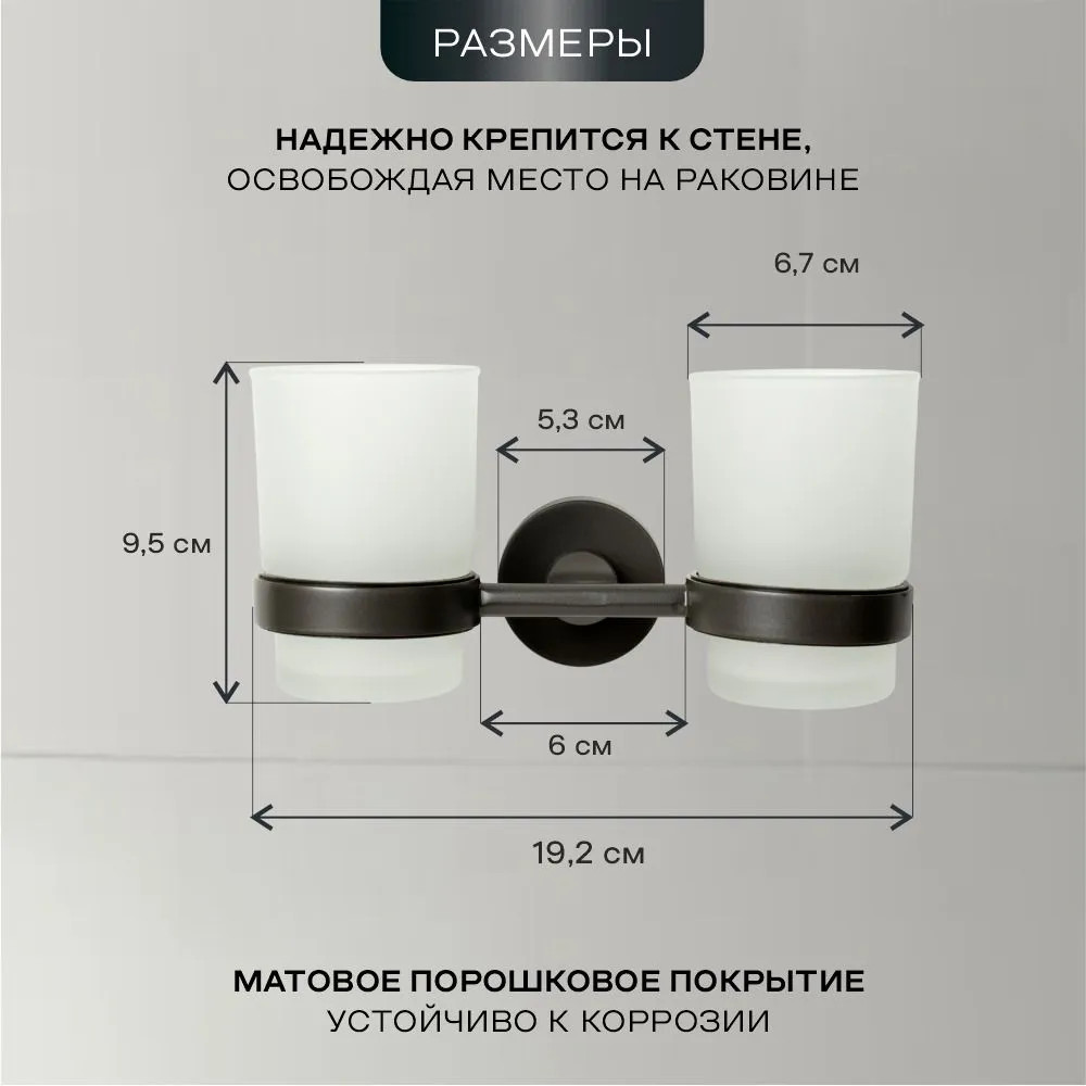 Изделие выполнено из металла и матового стекла. Стеклянные предметы отличаются своей прозрачностью и придают ощущение легкости и воздушности. В комплекте 2 съемных стакана цилиндрической формы, объемом по 150 мл. Держатель металлический с антикоррозийным покрытием. Двойная подставка для зубных щеток и пасты монтируется к стене при помощи крепления, входящего в комплект. Настенная установка экономит пространство на раковине и придает удобство в использовании. Аксессуар можно использовать не только как стакан для зубных щеток или стакан для полоскания полости рта, но для бритвенного станка, расчески, как органайзер для хранения кистей для макияжа и других предметов гигиены.